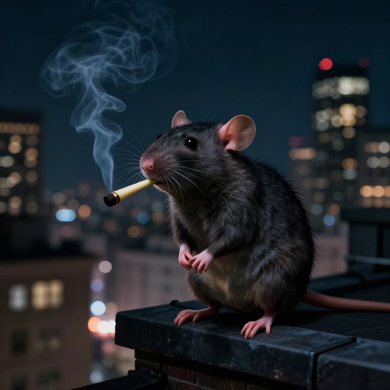 A mischievous rat smoking a blunt, perched on a city rooftop at night, city skyline glowing in the background, atmospheric smoke effect, detailed fur, expressive eyes, urban noir style illustration