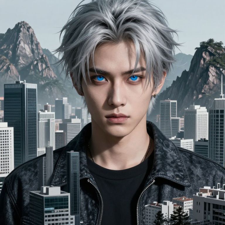 Digital artwork of a silver-haired, blue-eyed young man with intense gaze, wearing a black jacket, standing in a futuristic cityscape with mountains in the