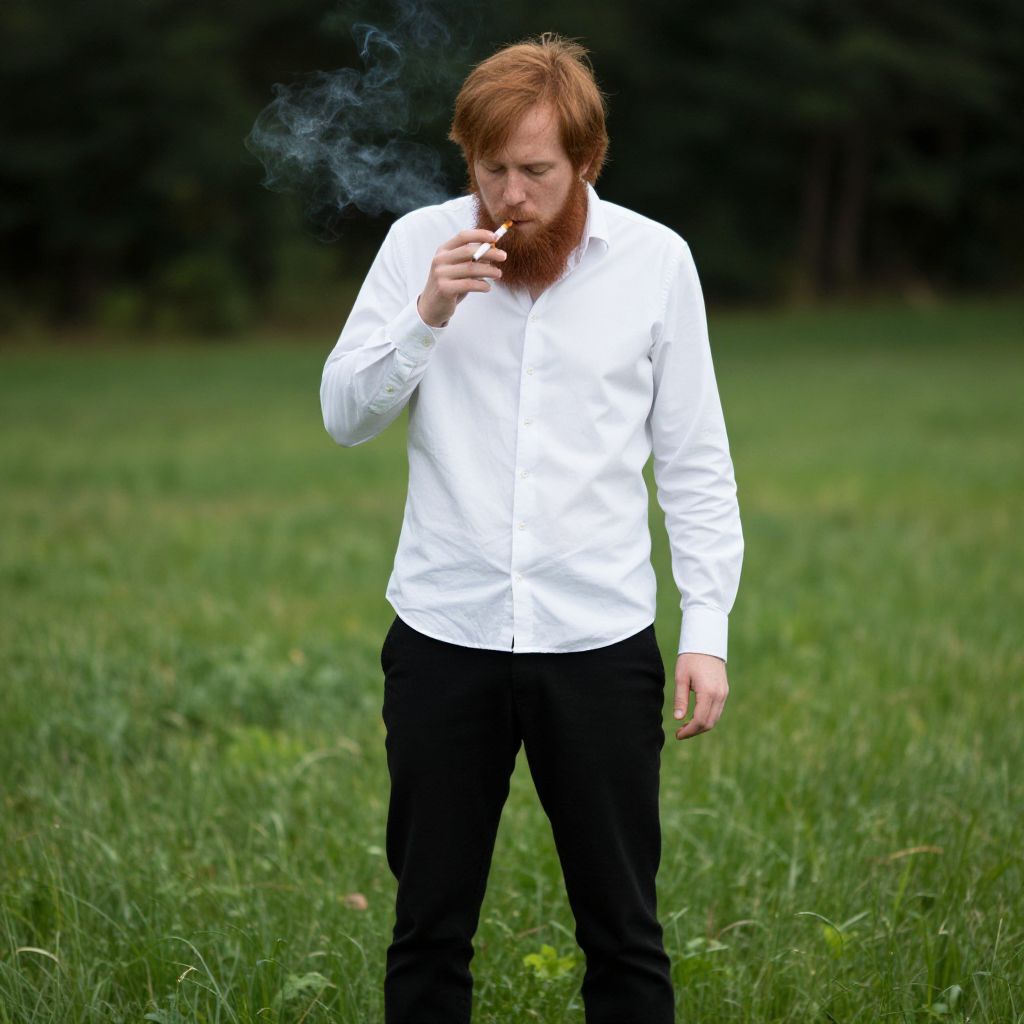 Man eating venus fly trap, 1boy, male focus, solo, shirt, white shirt, red hair, pants, black pants, facial hair, beard, long sleeves, outdoors, standing, grass, cigarette, day, smoking, realistic