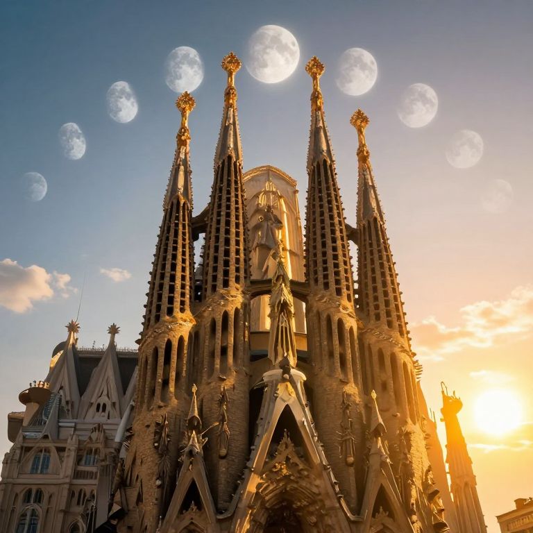 Photograph of Sagrada Família at sunset, featuring towering spires adorned with gold crowns, against a sky with multiple visible moons.