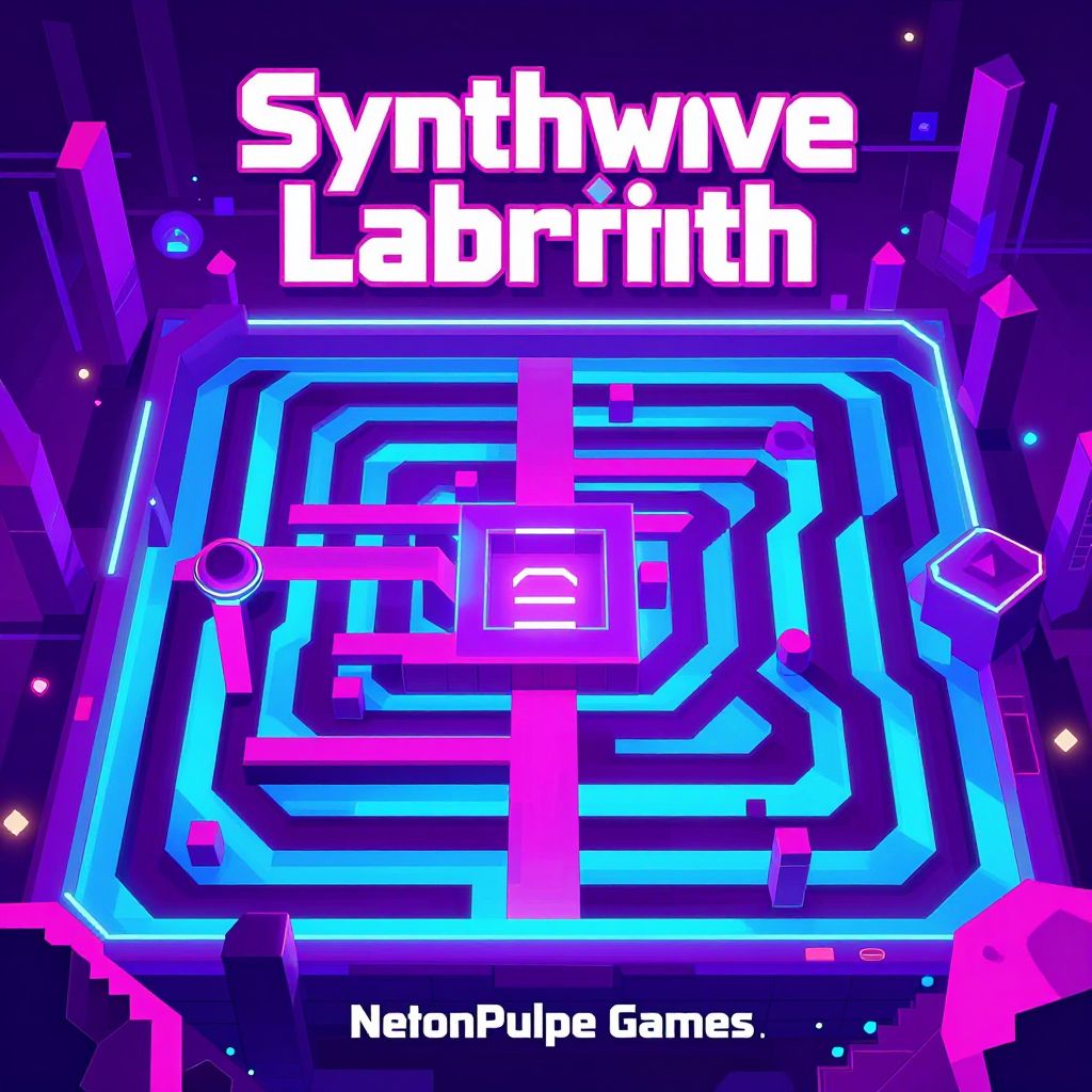 Promotional digital artwork for the game 'Synthwave Labyrinth' by NeonPulse Games featuring a puzzle platformer maze design in high-contrast neon colors with a limited palette of pink, purple, and cyan. The labyrinth is detailed with geometric shapes and glowing edges in a futuristic synthwave aesthetic. Released in 2026 and recognized for its unique art style.