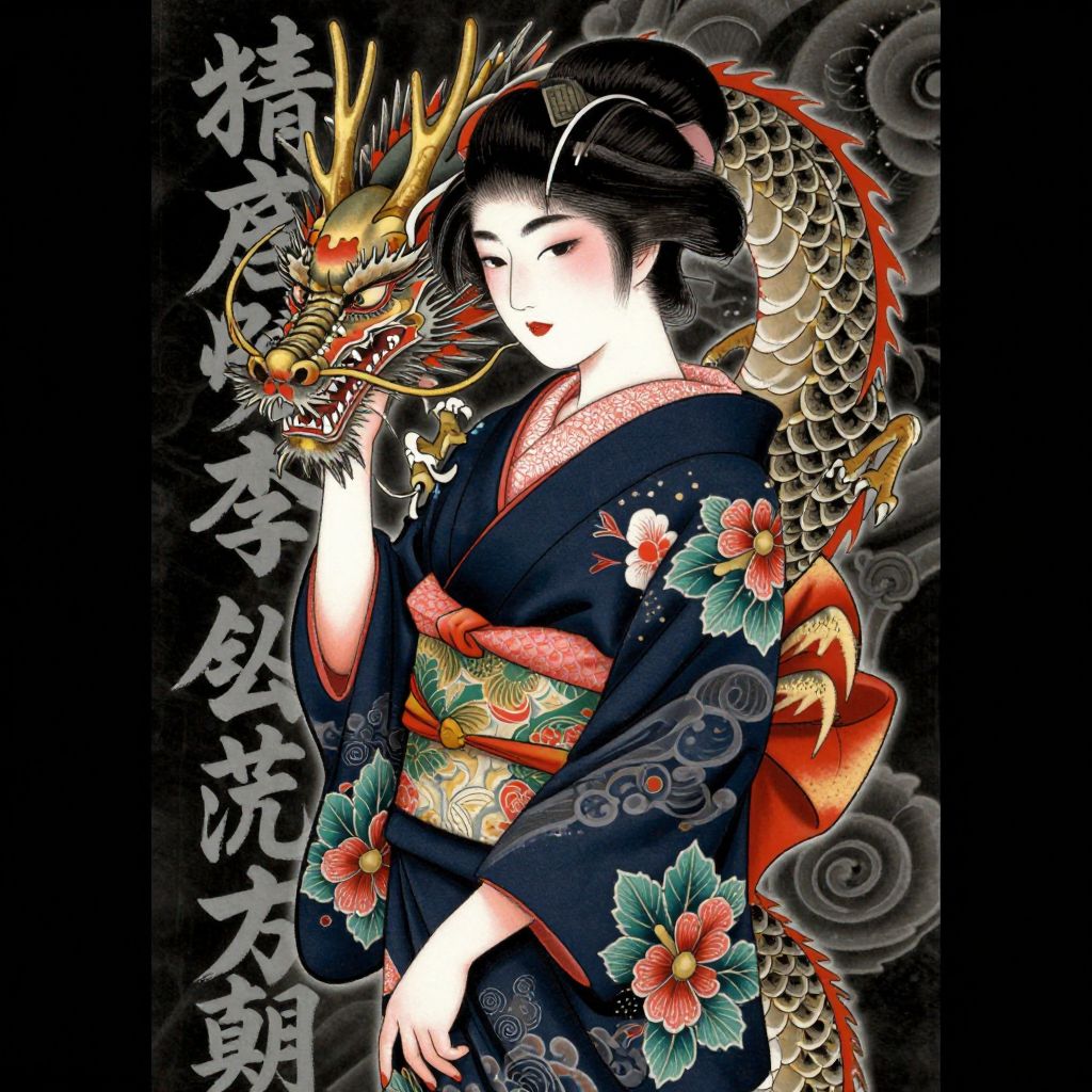 This is a vibrant, detailed tattoo-style illustration of a serene woman with closed eyes, wearing a traditional Japanese kimono. Her dark hair is adorned with colorful flowers, and the kimono features intricate patterns and colors, including red and green. The background is filled with more flowers, adding depth and warmth to the image. The overall style is rich and expressive, with a focus on traditional Japanese aesthetics.