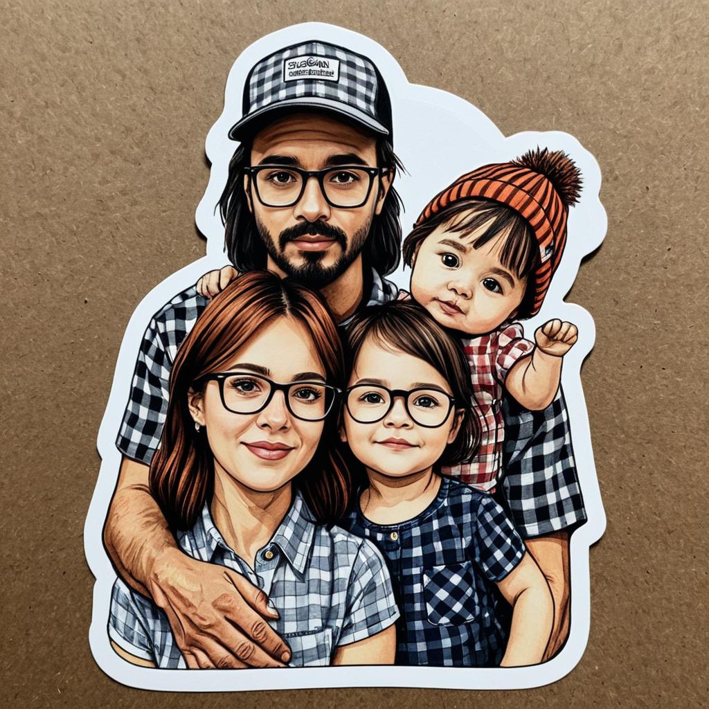 Eco-Friendly Sticker realistic drawing of a toddler girl with his mother and father, his mother is black with long hair, hazel eyes and glasses and his father is auburn with short hair, cap on the back and checkered shirt.
