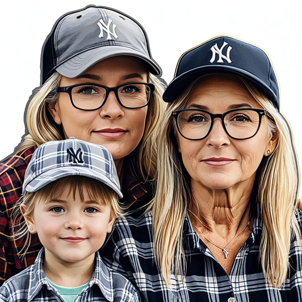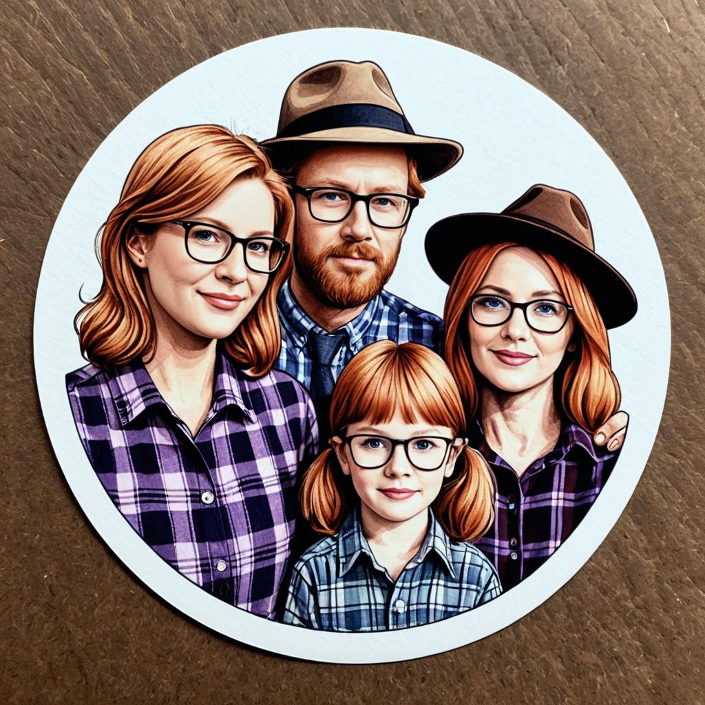 Realistic drawing of a family featuring a toddler girl with brown hair and glasses, her mother with auburn hair and glasses wearing a checkered shirt, and her father with dark hair, glasses, a checkered shirt, and a cap. The family members wear various checkered clothing styles. The toddler wears a red striped beanie and a checkered shirt.