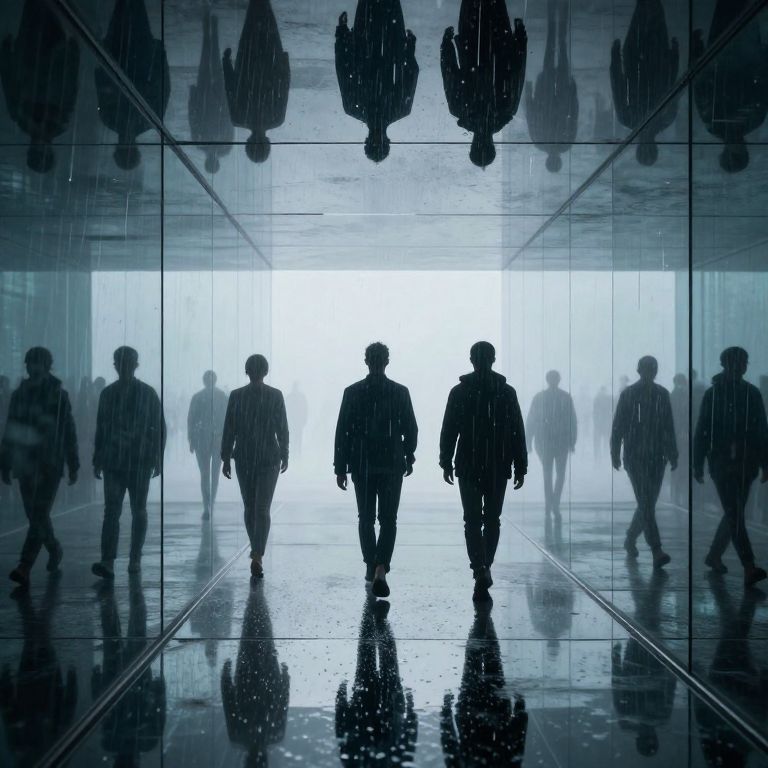 In a cyberpunk-inspired 3D render, a mirrored glass corridor creates paradoxical reflections as people walk forward into a foggy horizon, their silhouettes doubled by dramatic lighting and rain cascading from the ceiling, evoking a surreal, high-definition journey through time.