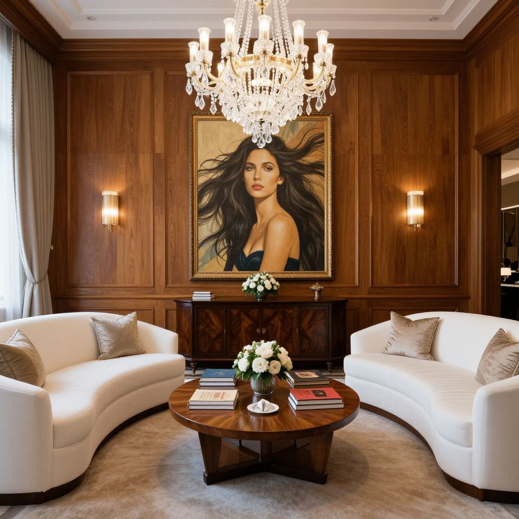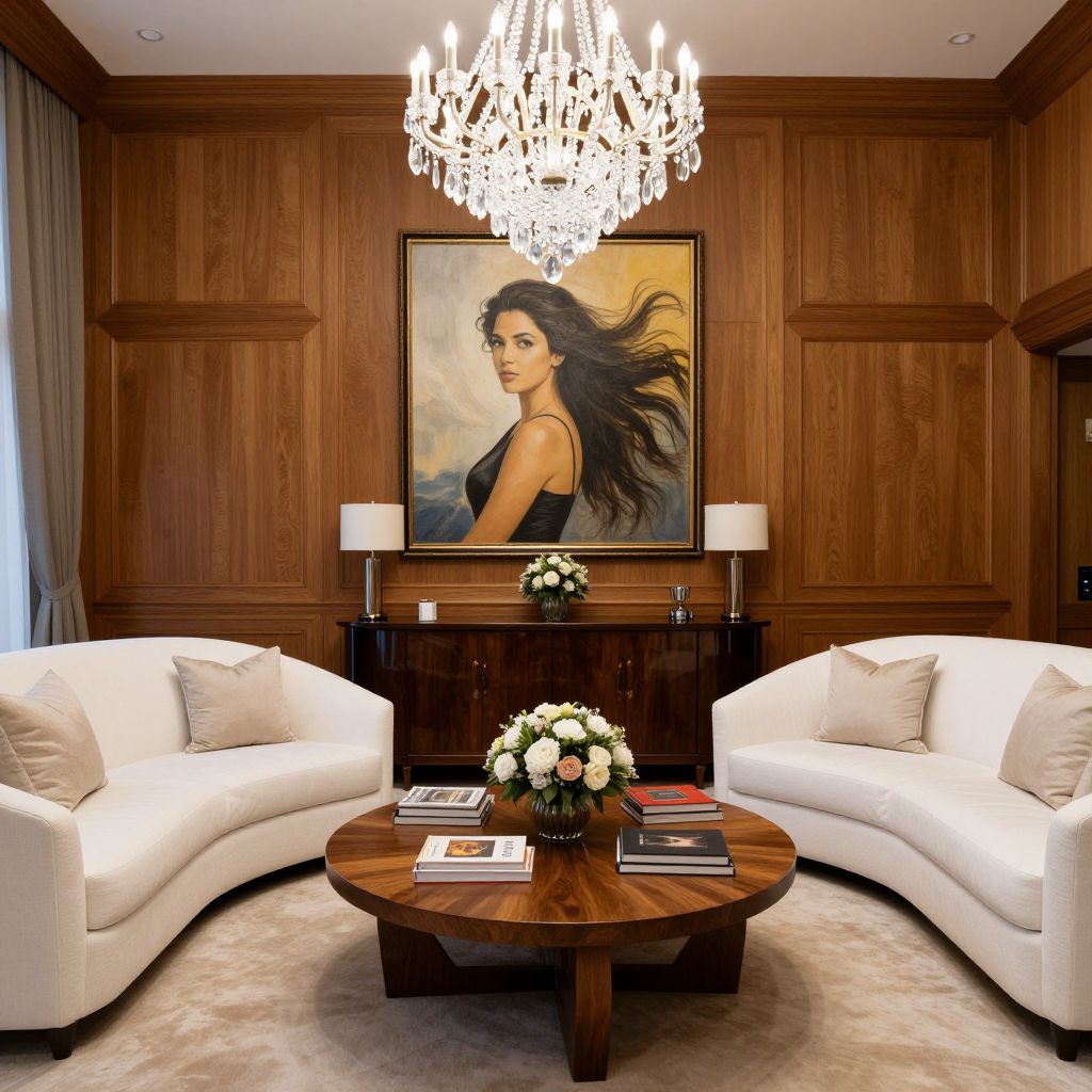 Luxurious lounge featuring two curved white sofas flanking a round wooden coffee table adorned with books and a floral arrangement, set beneath a grand crystal chandelier and framed by warm wood paneling and a striking portrait of a woman with flowing hair above a dark wooden console table.