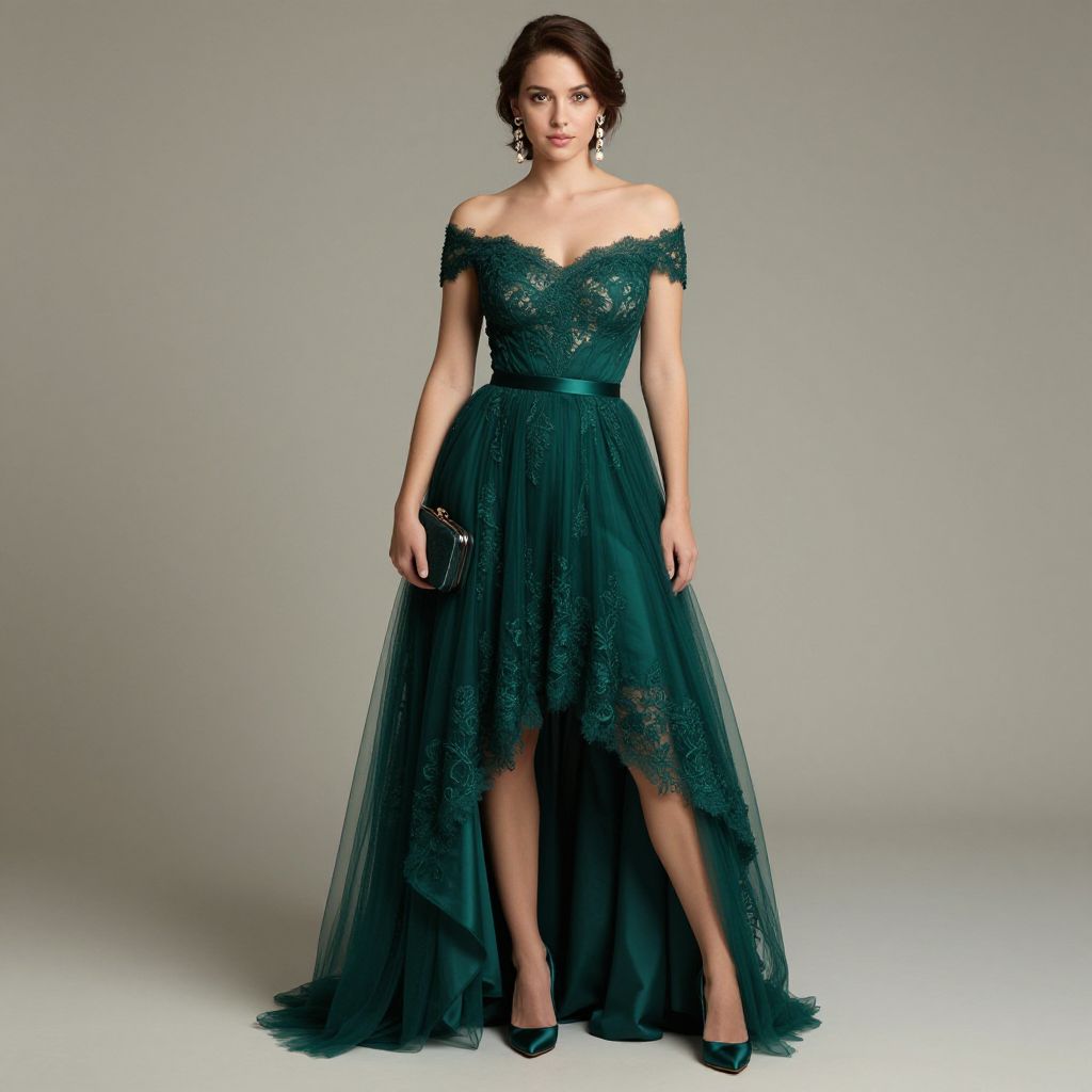 Photograph of a woman in an off-the-shoulder, dark emerald lace gown with a high-low hem and black heels, standing against a