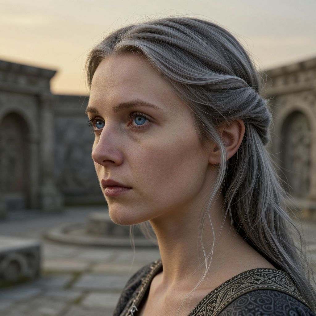 Photograph of a fair-skinned, blue-eyed woman with long, silver-gray hair partially braided, gazing thoughtfully to the right. Her expression is serious and focused. She wears a dark, patterned garment with intricate embroidery on the shoulders. The background features a stone courtyard with arched structures and a slightly blurred, warm sunset sky. The image has a realistic, slightly enhanced color palette, emphasizing natural textures and lighting. The woman's features are delicate, with a slightly flushed complexion and subtle makeup. Her hair appears slightly windswept, adding a sense of movement to the composition.
