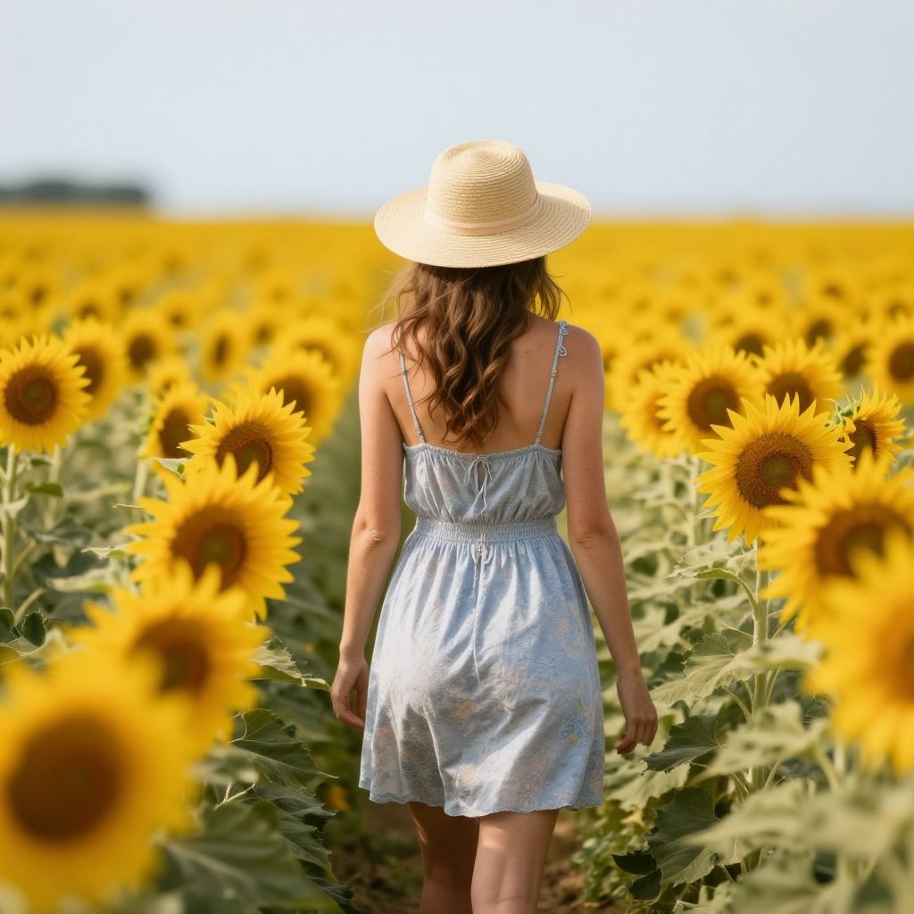 Photograph of a woman with long brown hair, wearing a white sundress and wide-brimmed hat, walking through a vibrant sunflower field.