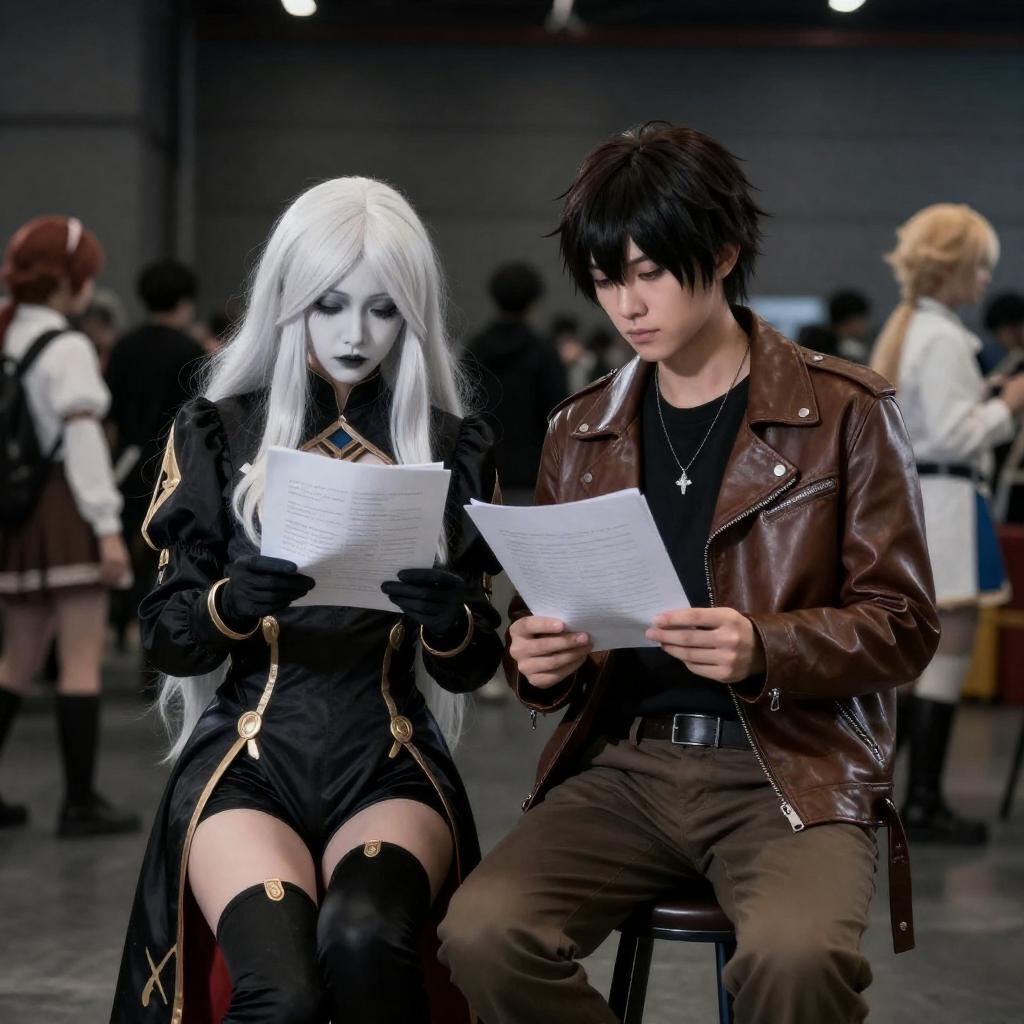 Photograph of a cosplay scene in a dimly lit room. A pale-skinned woman with long, white-blonde hair, painted white face, and black outfit with gold accents reads a paper. A dark-haired man in a brown leather jacket and pants reads a paper beside her. Background includes other cosplayers and industrial-style decor.