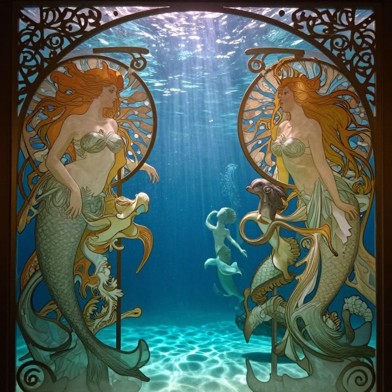 Craft an image embodying the intricate details and vibrant colors reminiscent of Alphonse Mucha's captivating style. In this enchanting scene, a mesmerizing mermaid emerges from iridescent waters, her scales reflecting a spectrum of hues like a stained-glass window. From a high vantage point, observe the ethereal beauty as she gracefully rises through shimmering waves, leaving a trail of luminescent bubbles and captivating onlookers with her enigmatic allure.