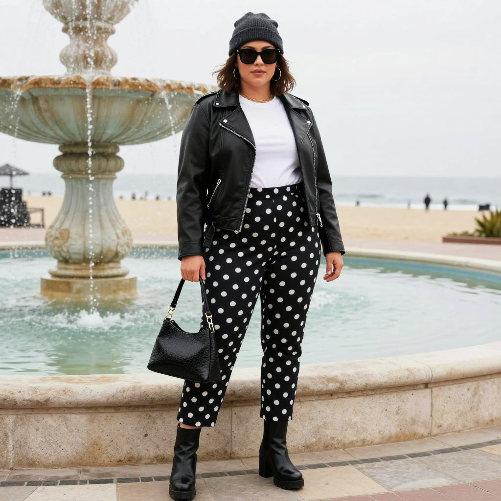 A lanky woman in a Shueisha visual style, wearing a black leather jacket, white t-shirt, and high-waisted polka dot trousers, stands near a beachside water fountain, accessorized with a dark beanie, oversized sunglasses, and chunky heel boots, holding a textured black handbag. Sexy