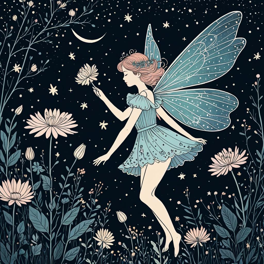A whimsical petal sprite illustration, using thin line art and flat color, high quality, capturing a delicate and dreamlike atmosphere with soft, ethereal details.