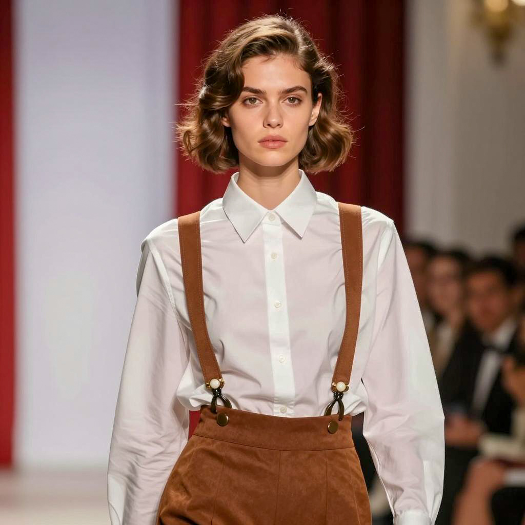 Model with long black hair, wearing a black blazer, black shirt, and black skirt, holding a black clutch with gold studs. She has a confident expression and is walking on a runway. Background shows blurred audience. Photograph.