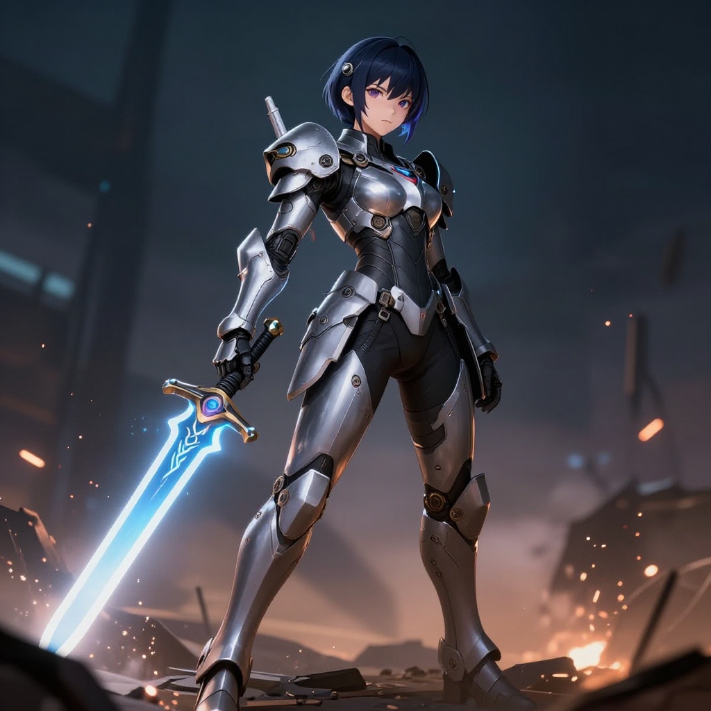 AI anime girl prompt showcasing a warrior android in futuristic armor, holding a glowing energy sword, standing on a battlefield with sparks flying, dramatic shadows, ultra-detailed cyberpunk aesthetic