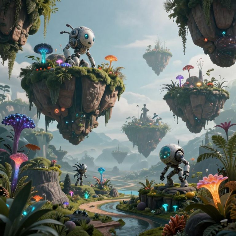 AI graphic generators designing surreal landscapes, dreamlike scenes with floating islands, bioluminescent plants, and robotic creatures, highly detailed textures, glowing elements, blending natural and synthetic environments, a fusion of nature and technology.