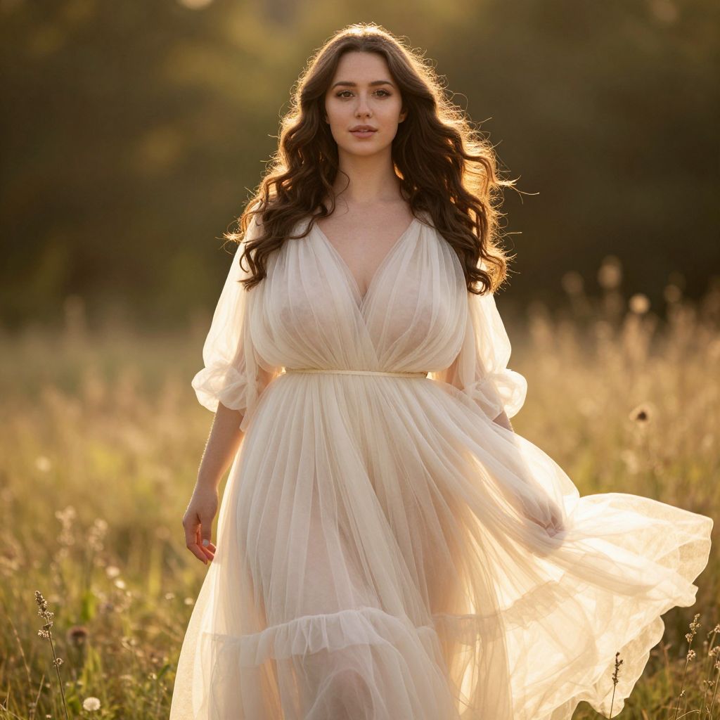 Photograph of a fair-skinned, brunette woman with long, wavy hair, standing in a sunlit meadow. She wears a flowing, sheer, white dress with a deep V-neck and puffed sleeves, illuminated by warm, golden sunlight. Her expression is calm and confident. The background is softly blurred, featuring tall grasses and green foliage. The dress's delicate, translucent fabric catches the light, creating a ethereal, almost magical effect. The overall composition highlights her natural beauty and the serene, idyllic setting.