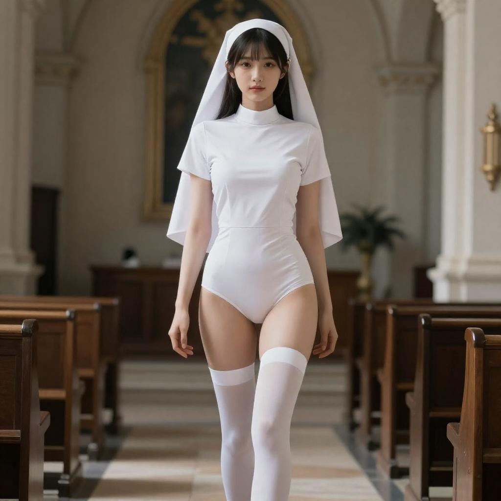Perfect skin, full body, (8k, RAW photo, best quality, masterpiece:1.2), (realistic, photo-realistic:1.4), 1girl, (aegyo sal:1), professional lighting, photon mapping, radiosity, white thighhighs, hair ornament, church, white wimple