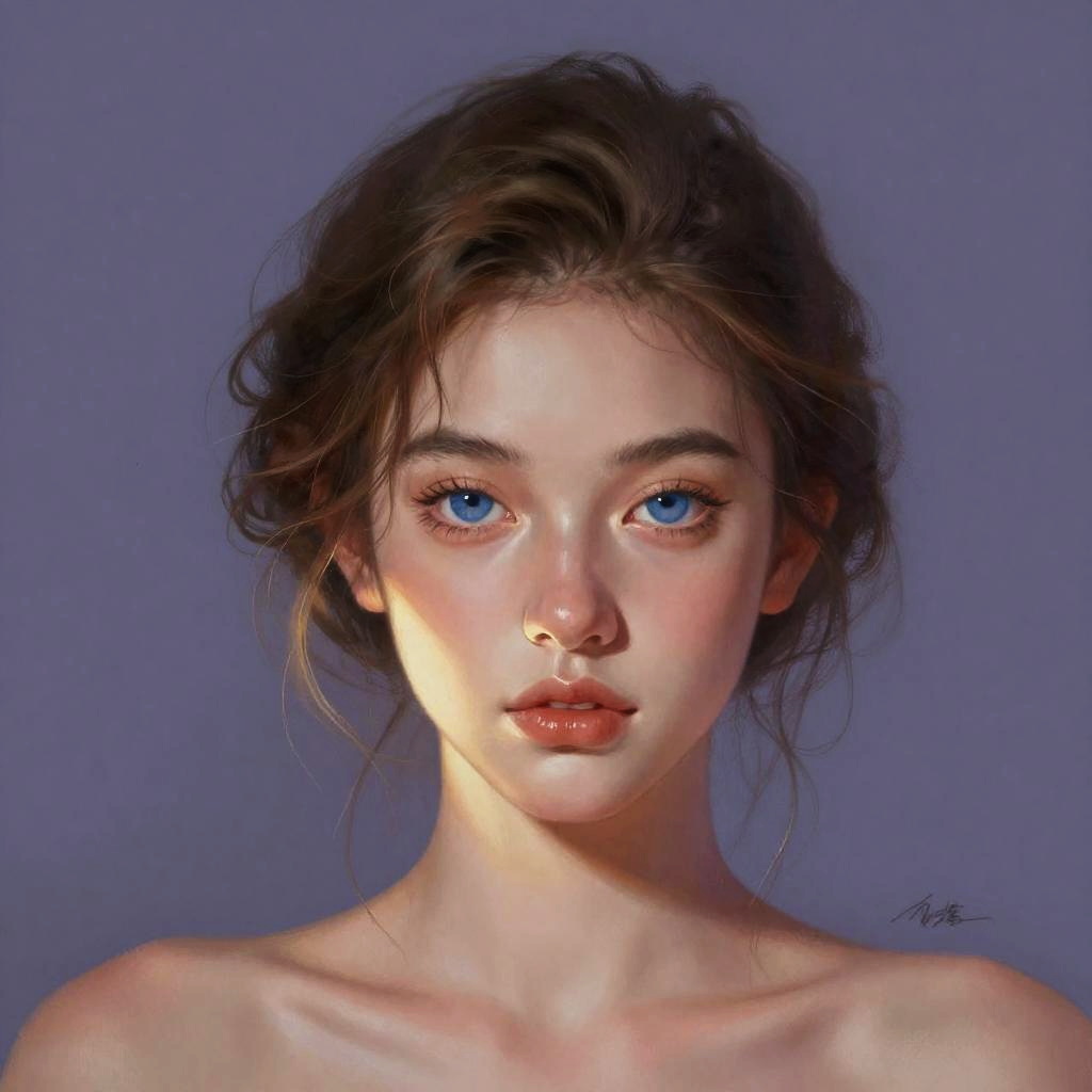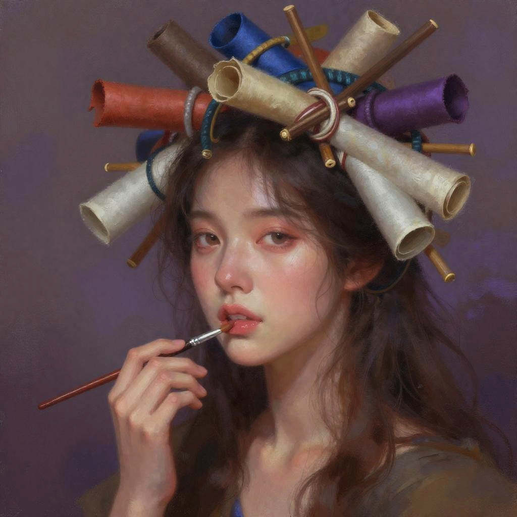 This is a digital painting of a woman with fair skin and wavy brown hair, wearing a pink bonnet with a bow, and a black dress with a pink ruffle collar. She holds a paintbrush in her right hand and has a calm, slightly smiling expression. The background is dark with warm, abstract colors. Color palette on the right shows shades used in the painting.