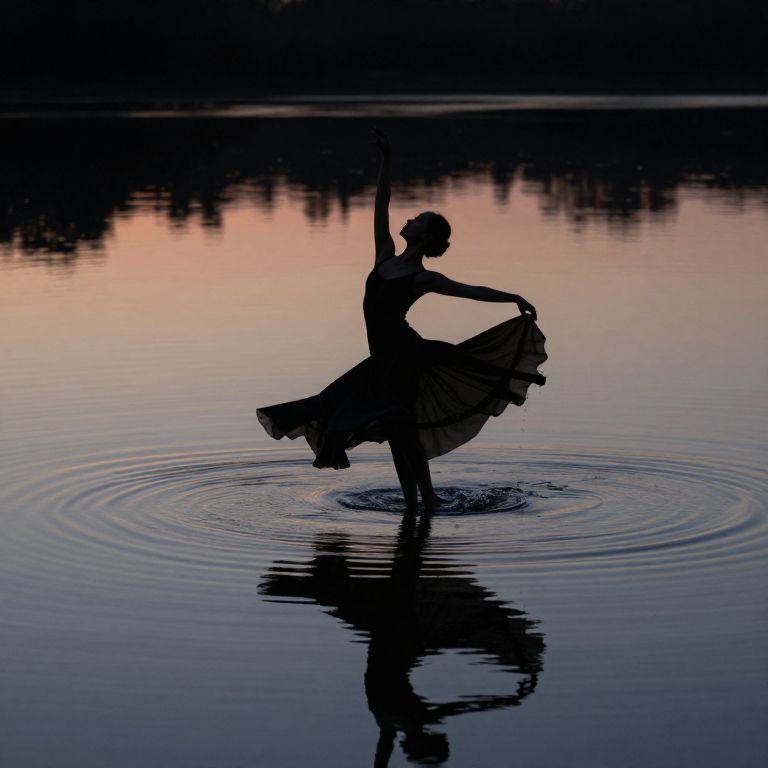 In a serene twilight embrace, a dancer's silhouette spins gracefully atop a tranquil pond, her movements stirring ripples that mirror forgotten dreams and evoke a profound sense of freedom and introspection, as the fading light whispers of transience and the enduring beauty of the present moment.