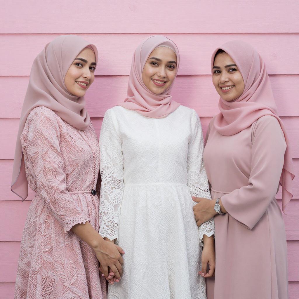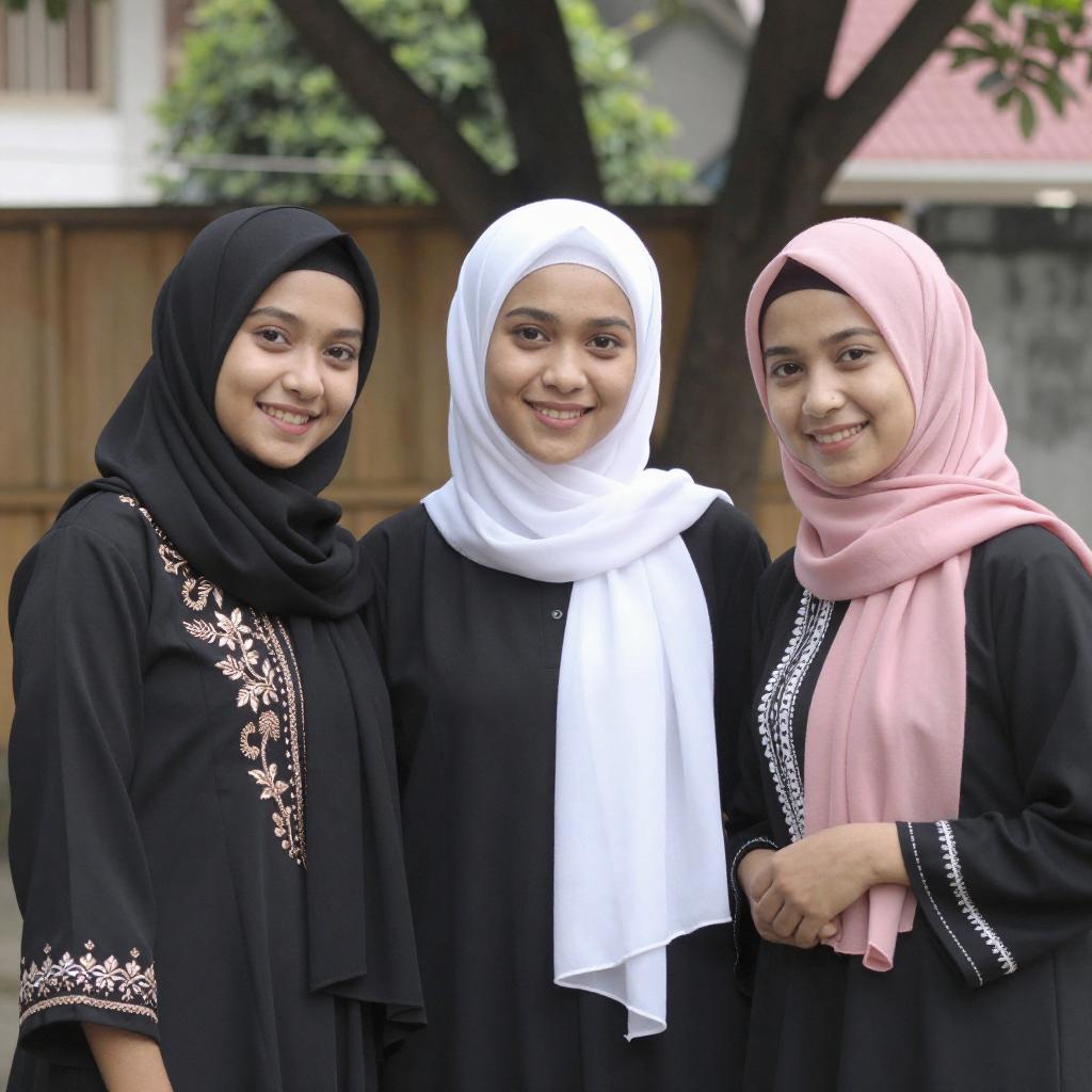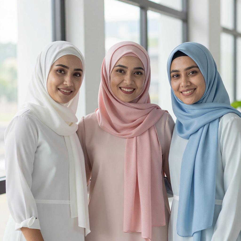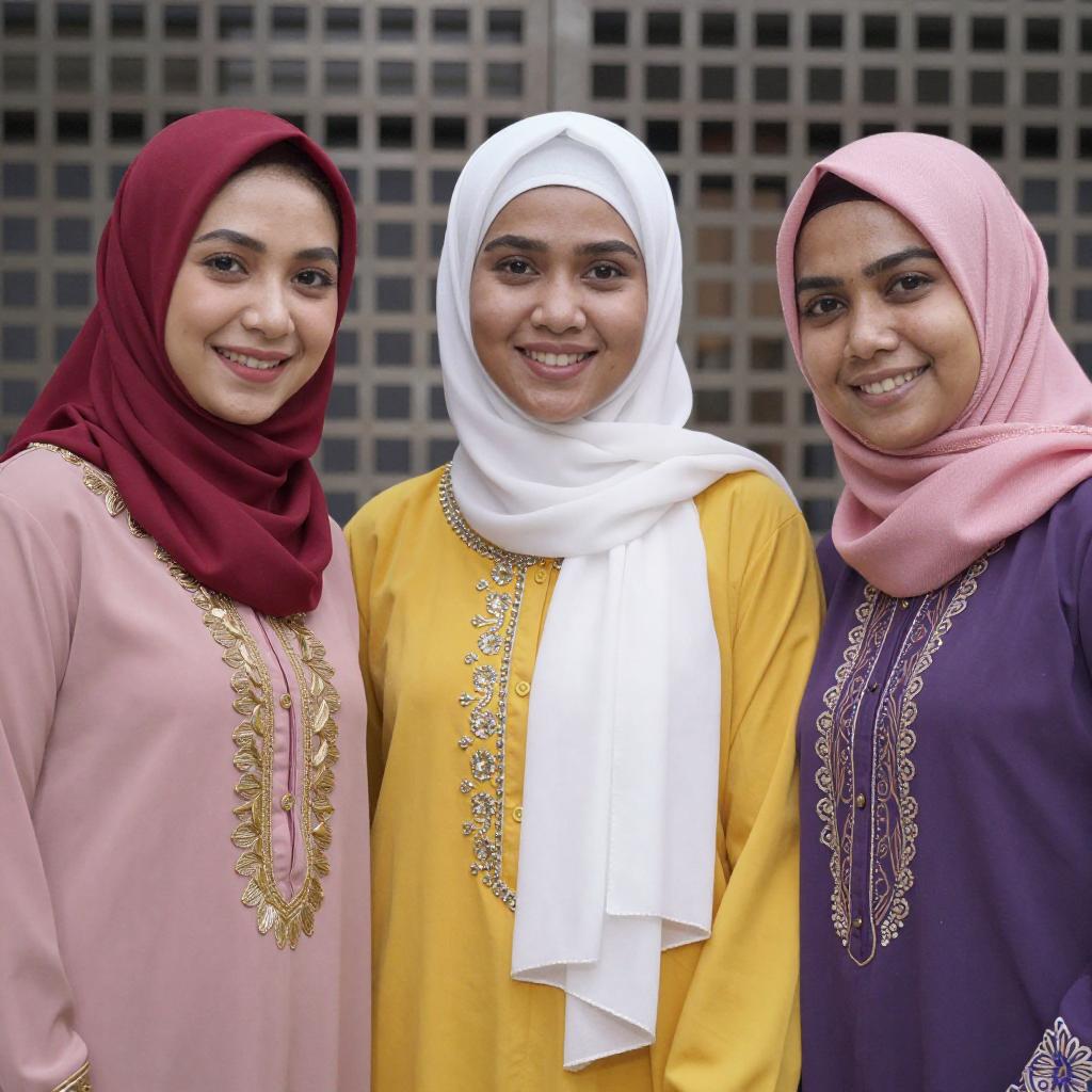 Photograph of three smiling women in colorful hijabs and traditional dresses. The woman on the left wears a red hijab and pink dress with gold embroidery. The center woman has a white hijab and yellow dress with silver embellishments. The right woman wears a pink hijab and purple patterned dress. They stand close together, with a grid-patterned background behind them.