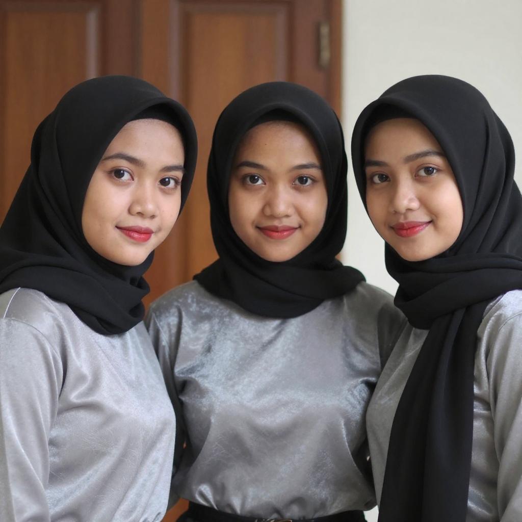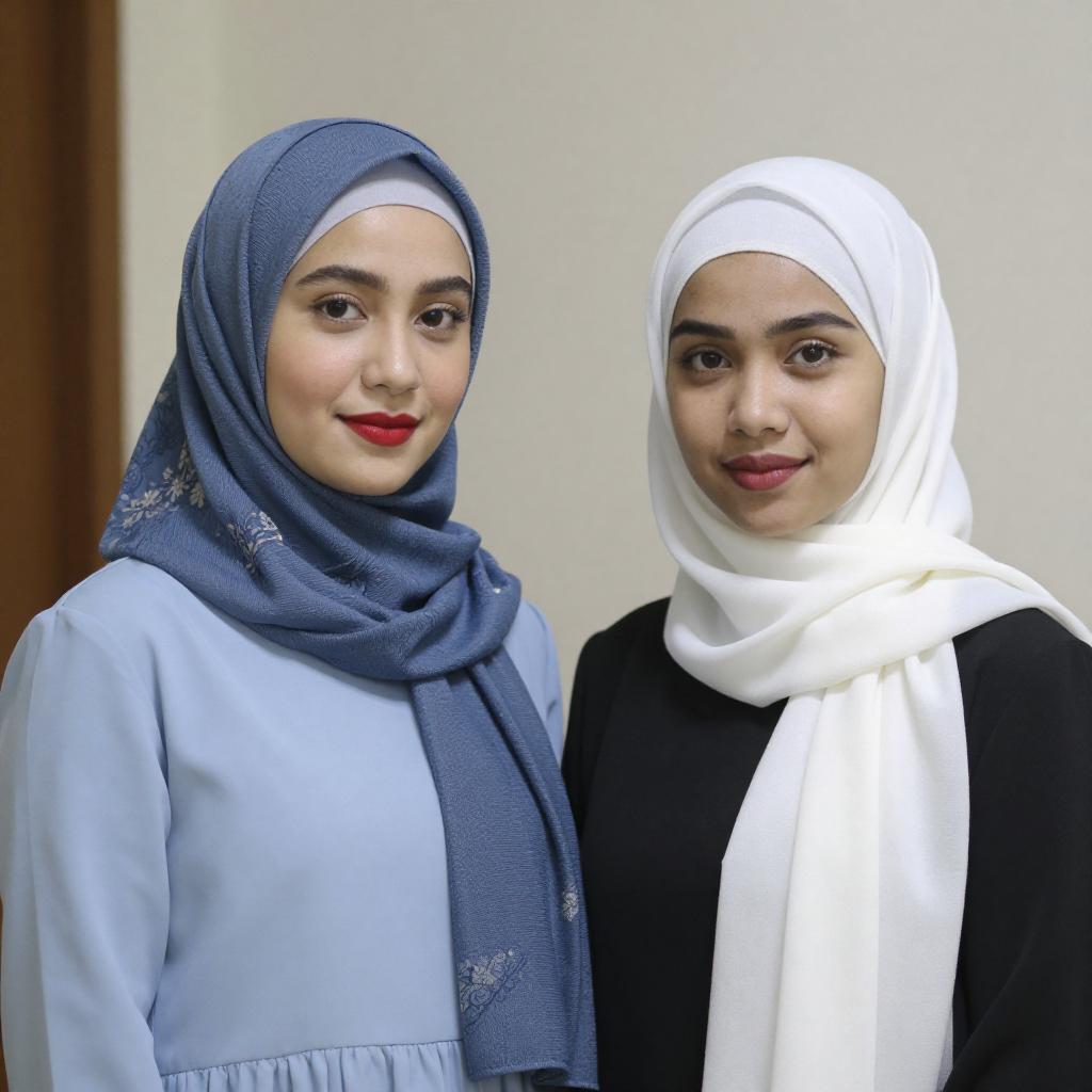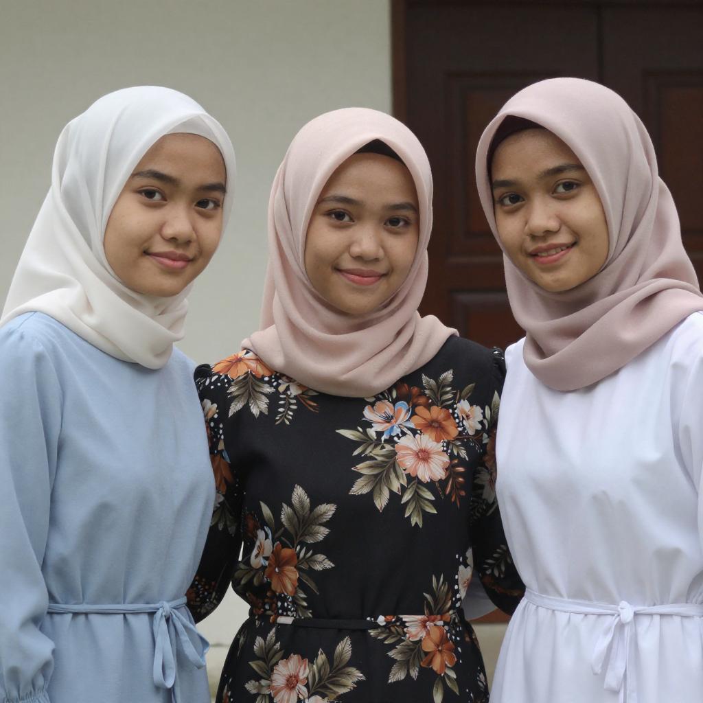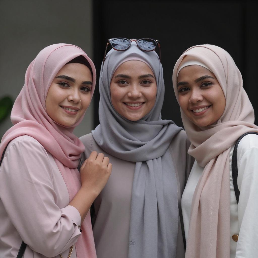 Photograph of three smiling women in colorful hijabs and traditional dresses. The woman on the left wears a red hijab and pink dress with gold embroidery. The center woman has a white hijab and yellow dress with silver embellishments. The right woman wears a pink hijab and purple patterned dress. They stand close together, with a grid-patterned background behind them.