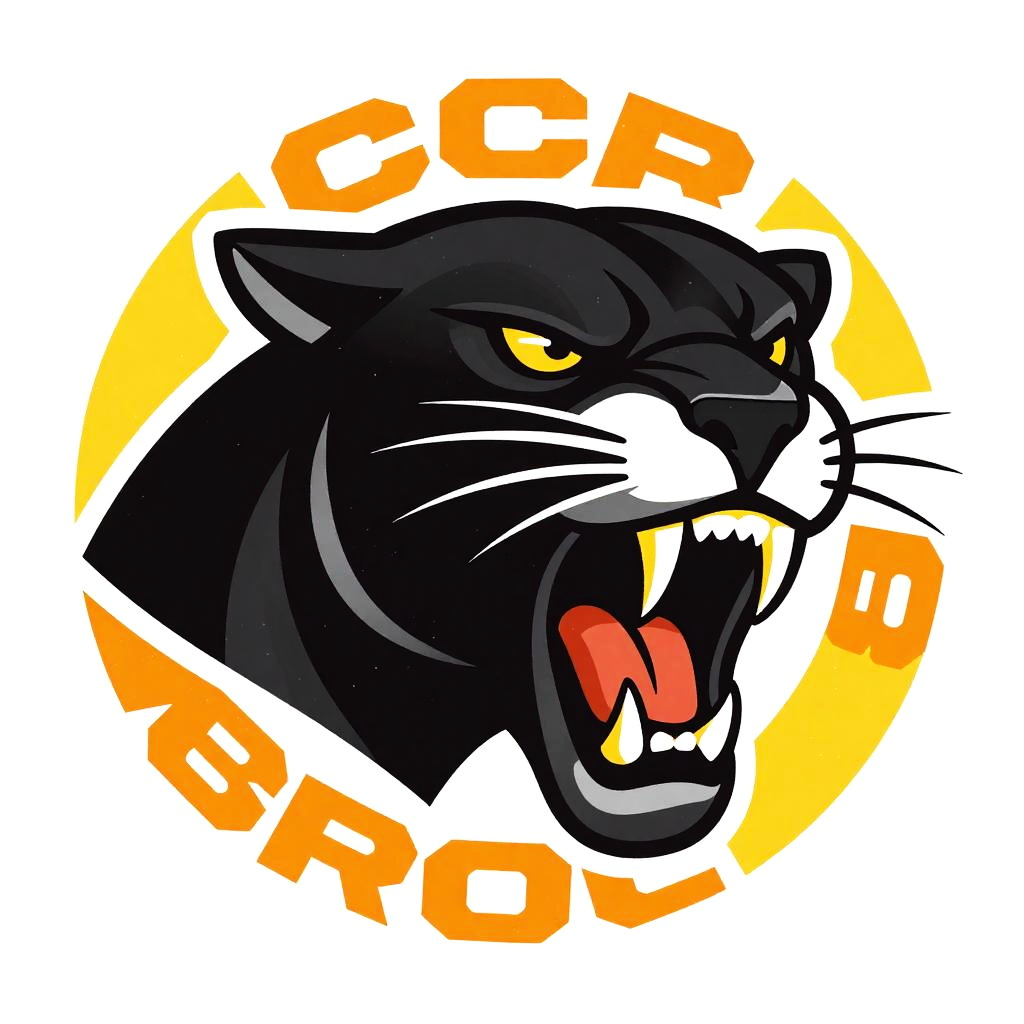 This is a bold, graphic-style logo featuring a black panther head with its mouth wide open, revealing sharp yellow teeth. The panther's eyes are fierce, and it has yellow line details. Surrounding the head are curved, orange-yellow words, creating a dynamic, energetic look. The image has a rough, textured finish, giving it a rugged, sports-team vibe.