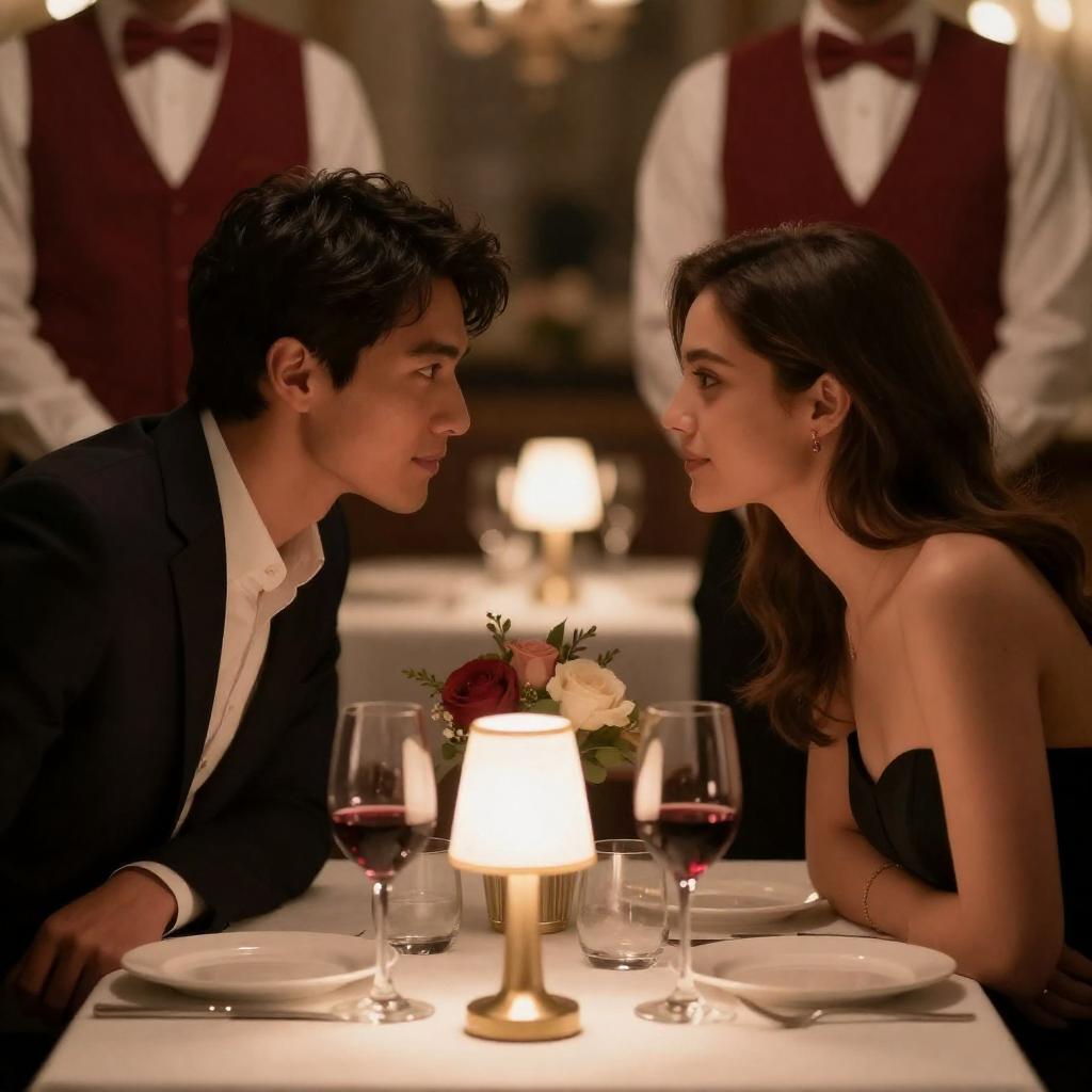 Photograph of a candlelit dinner table with seven people wearing wreaths on their heads. Seven tall candles on each side. Man in black tuxedo, woman in brown dress, and others in traditional clothing. Warm, dim lighting. Decorative garland on wall. Candles illuminate faces.