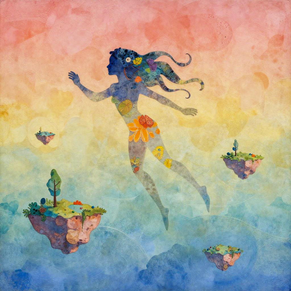 Abstract encaustic texture, gradient inking colors, Charles Rennie Mackintosh style, a whimsical cloud shape shifter, sky city, decoupage.