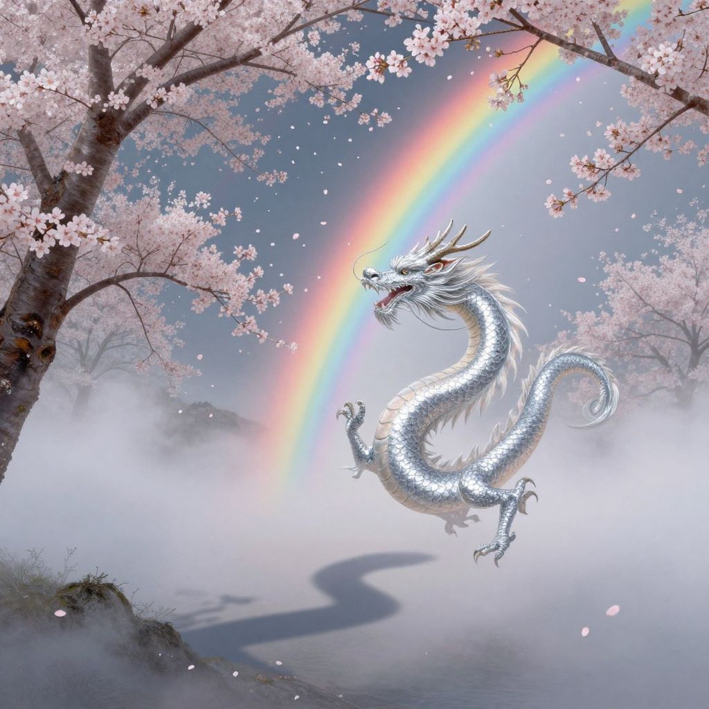 Digital painting of a shimmering, multi-colored dragon flying above a cherry blossom-filled garden with a koi pond and traditional Japanese pavilion.