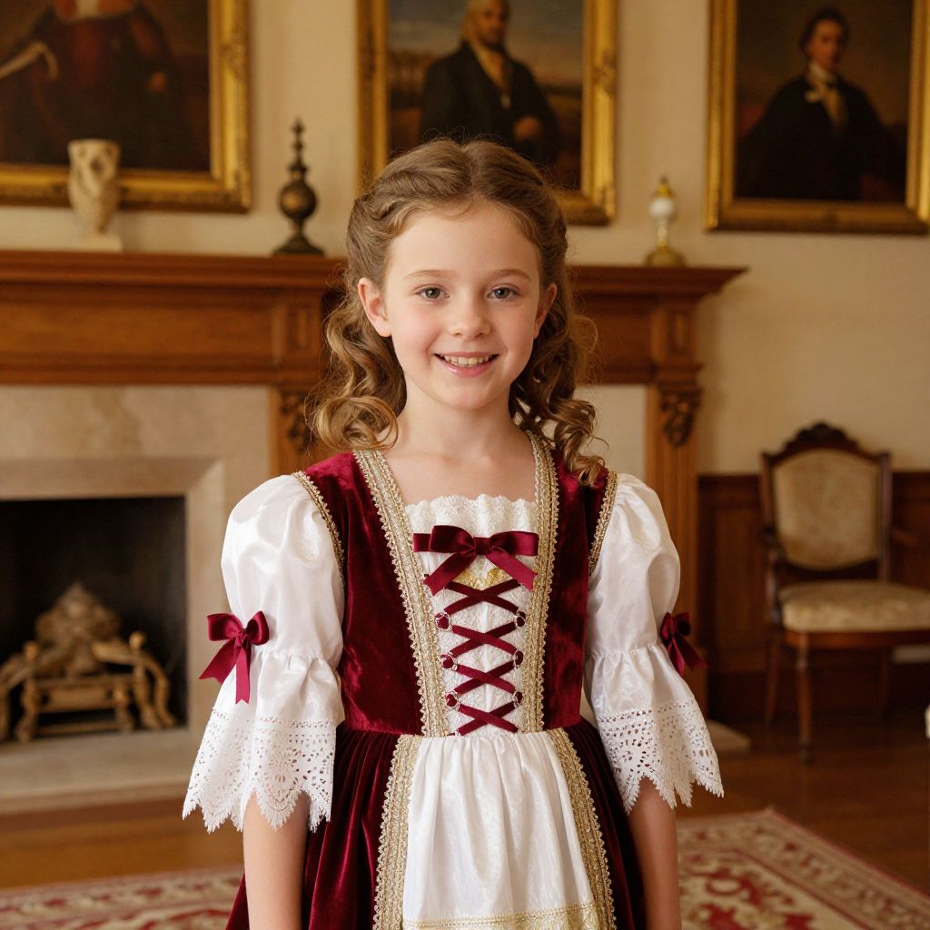Photograph of a young Caucasian girl with light skin and curly brown hair, standing in a traditional, warmly lit living room. She wears a white, puffed-sleeve dress with lace trim and a deep red velvet bodice, accented with maroon ribbon ties. She smiles brightly at the camera. The background features a wooden fireplace with a cream-colored mantle, ornate gold-framed portraits, a small statue, and a wooden chair with a cushioned seat. A red and white patterned rug is partially visible on the wooden floor. The overall style is vintage and elegant.