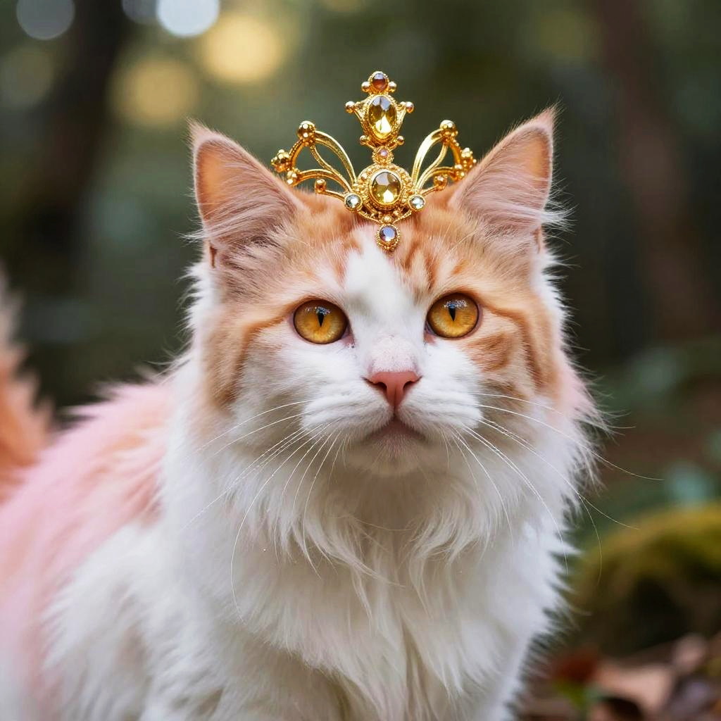 Photograph of a stylized bird with a bright white feathered body, a striking blue beak, and a detailed, ornate headpiece resembling a headdress. The headpiece is adorned with gold and red jewelry, including a central blue gem and red tassels. The bird's feathers are fluffy and the background is blurred with green and white hues, making the bird the focal point.