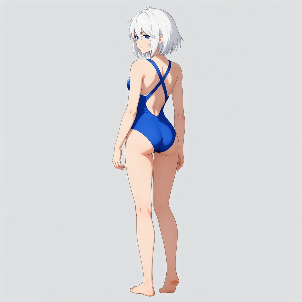 (masterpiece, best quality), chara-sheet, 1girl, short white hair, blue one-piece swimsuit, barefoot, simple backgound