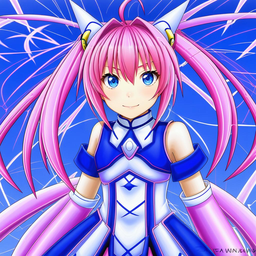 Caro ru lushe, lyrical nanoha, 1girl, blue eyes, pink hair, ahoge, by artist terrajin, anime