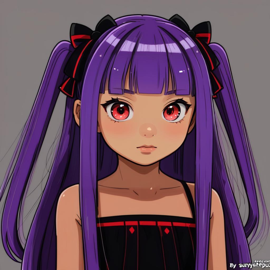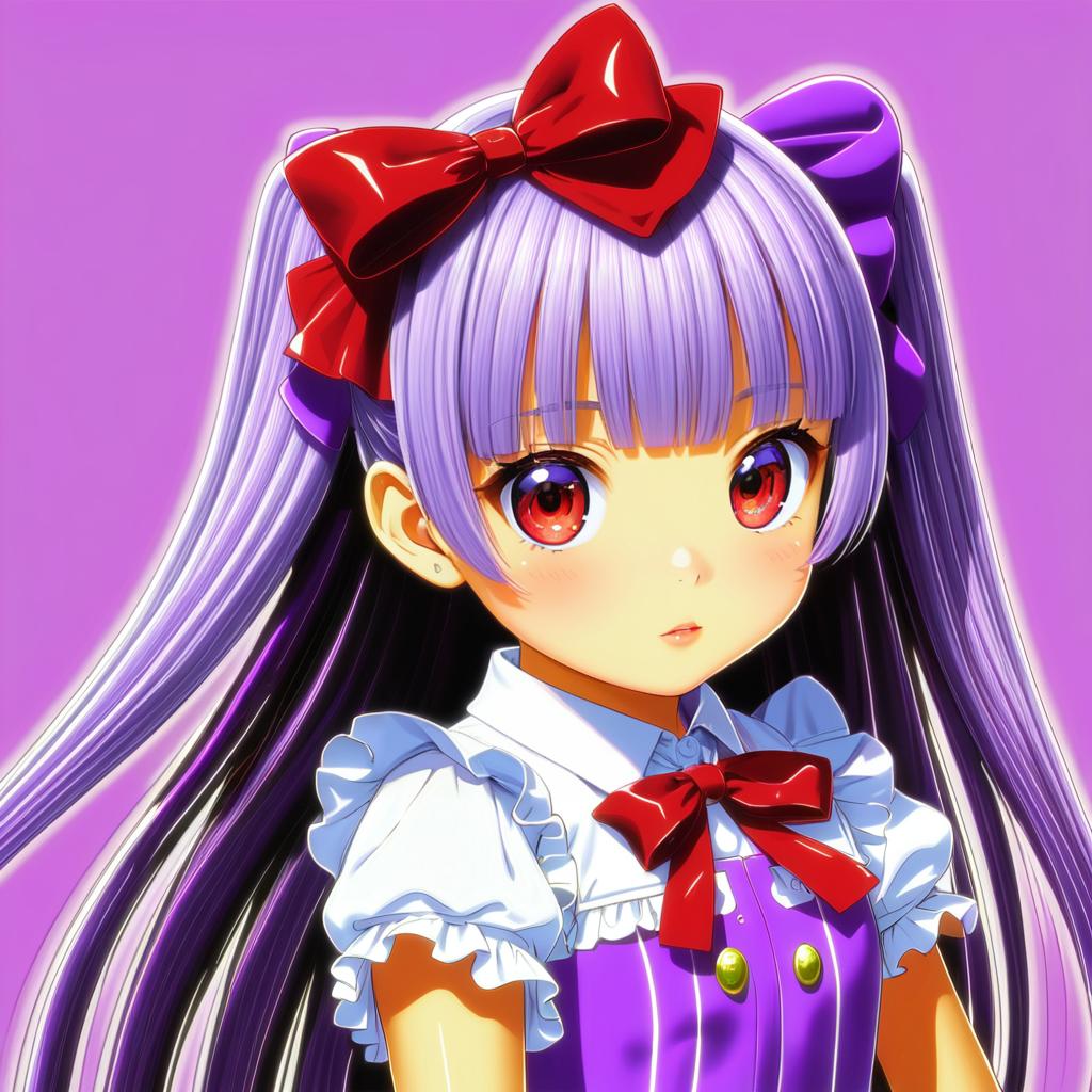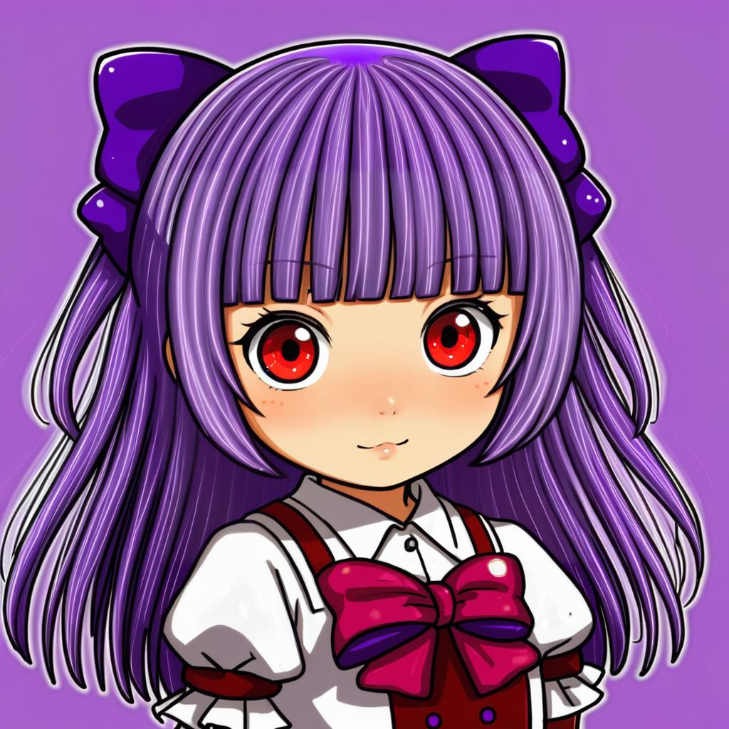 3.1-tan, os-tan, 1girl, loli, red eyes, long hair, purple hair, grey hair, blunt bangs, hair bow, flat chest, by artist beijuu, anime