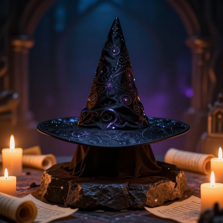 Black wizard hat with wide brim and pointed tip, decorated with shimmering mystical patterns, sitting on a stone altar surrounded by glowing candles and spell scrolls, dark magical ambiance, vivid colors, high resolution fantasy illustration.
