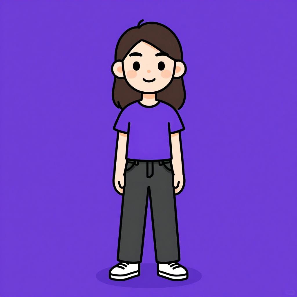 Digital cartoon of a young girl with brown hair, wearing a purple shirt, black pants, and white sneakers, against a solid purple background. Simple,