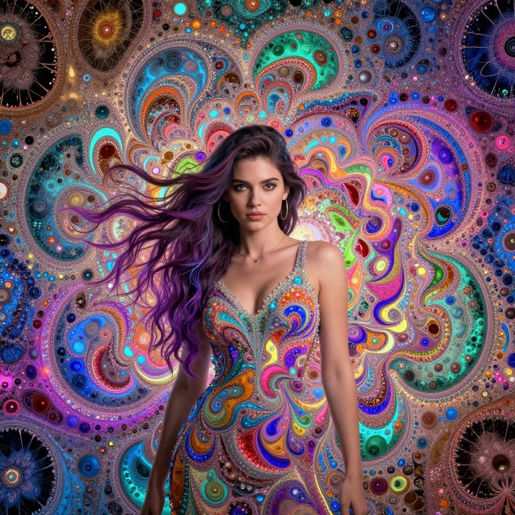 Photograph-style digital artwork of a beautiful woman with flowing brown hair, wearing a sparkling, multicolored, swirl-patterned dress, against a vibrant