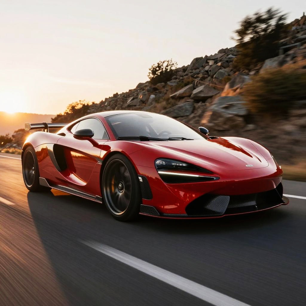 Decapotable car cruising along a coastal road at sunset, vibrant orange and purple sky, sleek reflection on gleaming paint, palm trees swaying, cinematic atmosphere, soft lighting, dynamic angle, photorealistic style