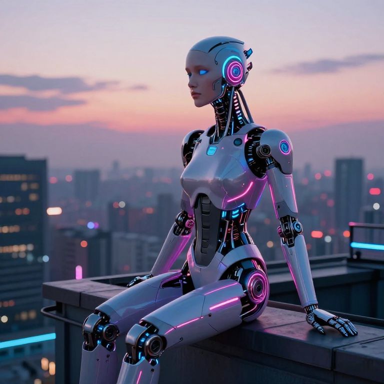 Digital art: A futuristic, glowing, white and pink robotic woman with blue eyes sits on a rooftop at sunset, overlooking a cityscape with neon lights