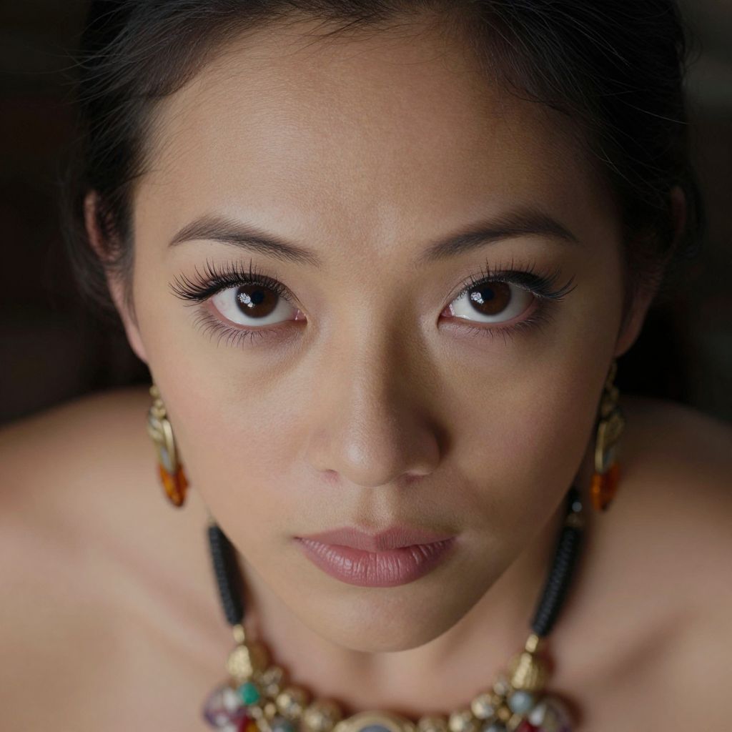 A hyper-realistic portrait captures a Micronesian woman's enigmatic gaze from an unconventional bird's-eye view. Her eyes, framed by long lashes, tilt towards us, revealing soft porcelain skin bathed in ethereal light. Adorned with intricate jewelry and fine fabrics, she exudes elegance amidst intrigue. This cinematic scene blends classical portraiture with surrealism, inviting viewers to explore the depth of her gaze and uncover hidden secrets.