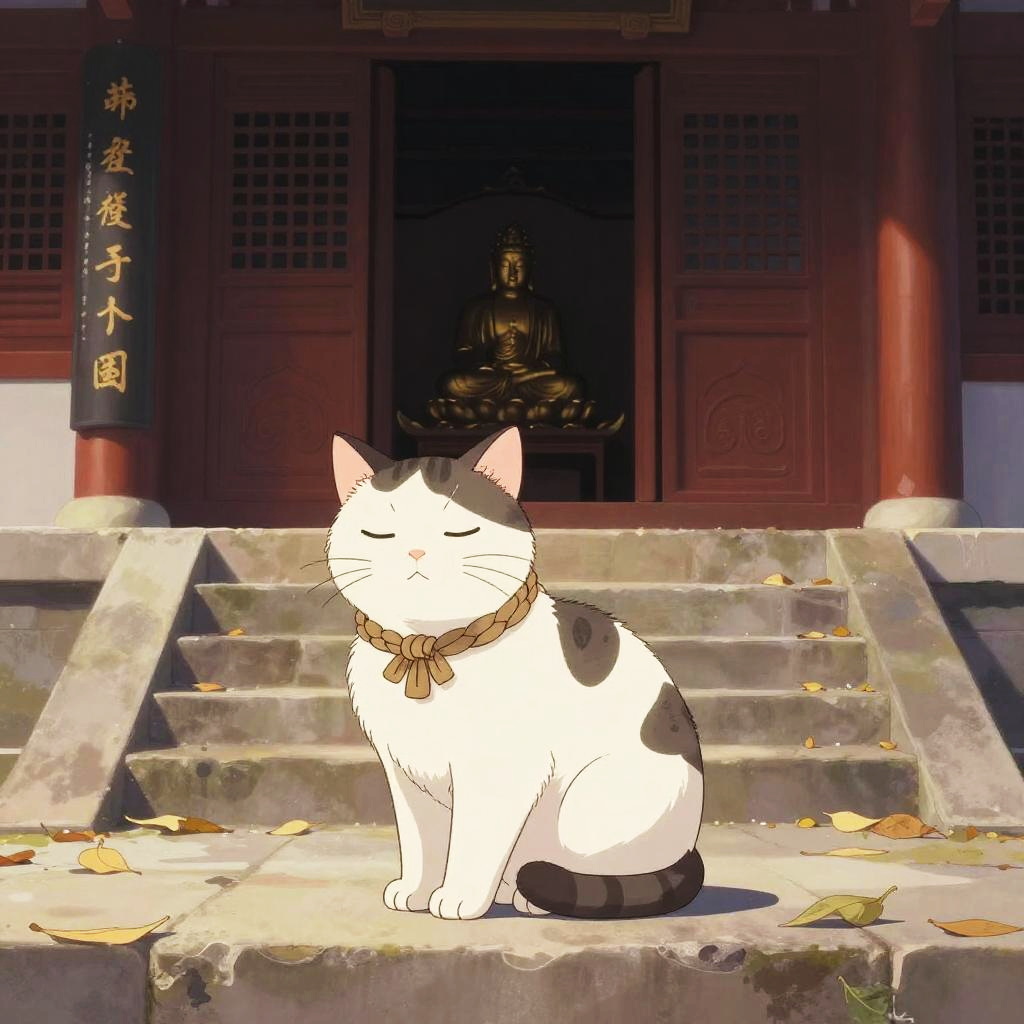 A sleepy temple cat, wearing a soft braided collar, sitting in steps of an ancient Buddhist temple, surrounded by gentle sunlight and falling dried leaves, illustrated in the nostalgic and atmospheric manga style of Tadao Tsuge.