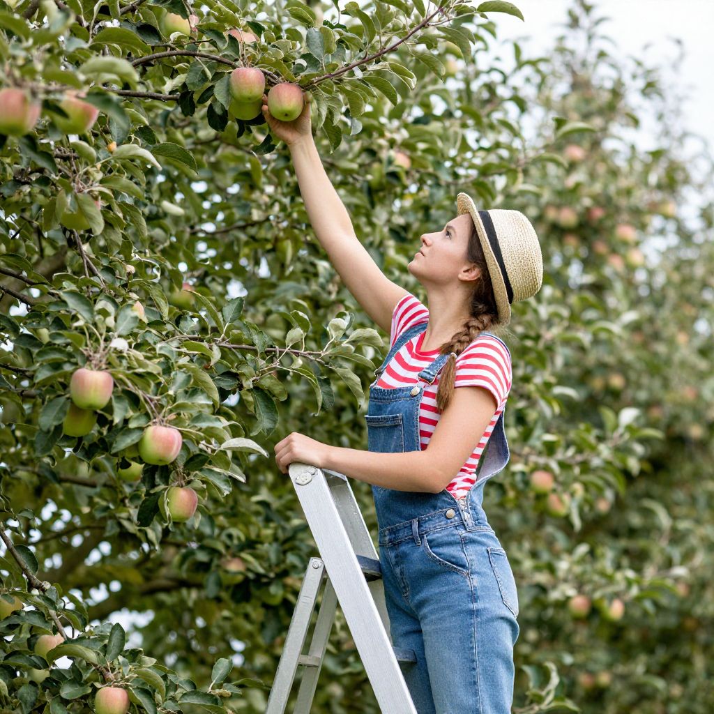 Photograph of a young woman with light skin and brown hair, wearing a straw hat, red and white striped shirt, and blue denim overalls, climbing a white ladder to pick apples from a lush green apple tree. She reaches up with her right arm to grasp a ripe apple. The background is filled with dense apple tree branches and apples, with sunlight filtering through the leaves. The scene exudes a rustic, autumnal atmosphere.