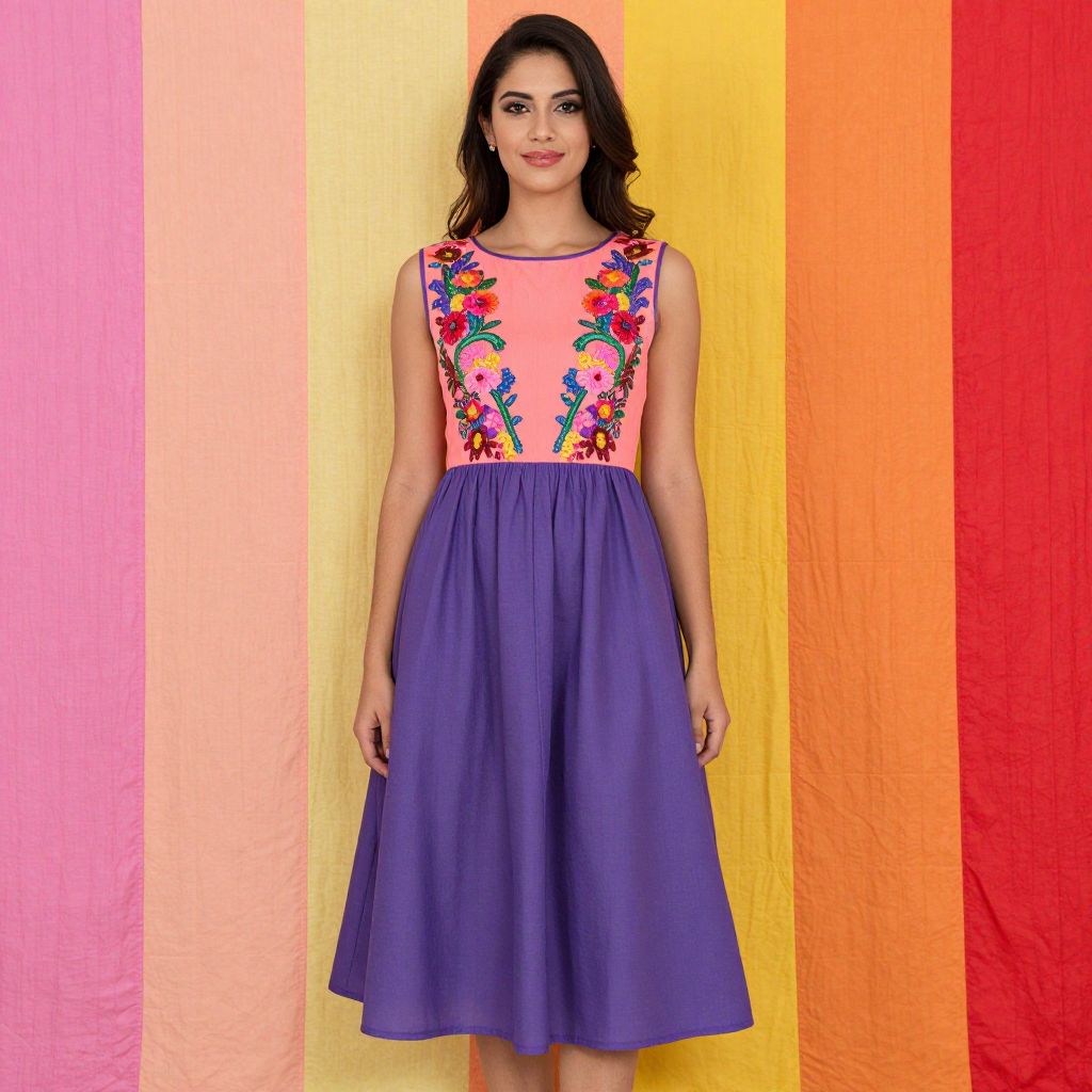 Woman standing against a vibrant quilted backdrop featuring vertical stripes of pink, peach, yellow, orange, and red, wearing a sleeveless dress with a pink bodice adorned with colorful floral embroidery and a purple skirt.