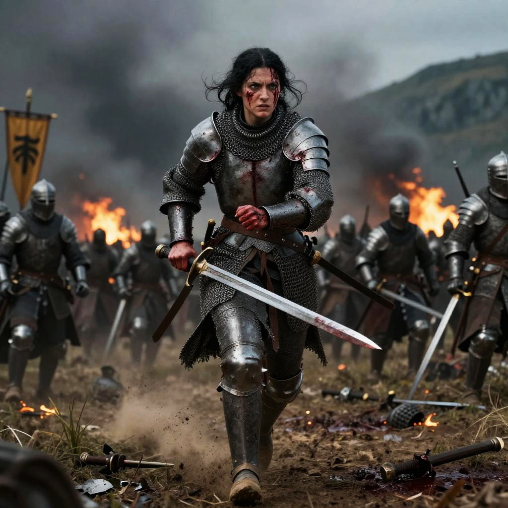 A medieval worrior woman, running:4, holding a blade, wounded, bleeding, arms close and hands together, angry face, (closed mouth), (blue eyes), (black hair) wearing heavy chainmail war armor with blood strains and scratches, one piece shoulder pad, war grounds, medieval battle, thousands of soldiers behind, yellow banner, mud, blood on ground, damaged detailed:3 and different armors and blades, ashes:4 and fire, mountain, night and dark, ultra wide lanscape shot, side shot, full body shot, ultra detailed, ((realistic grayish colors)), ((best quality))