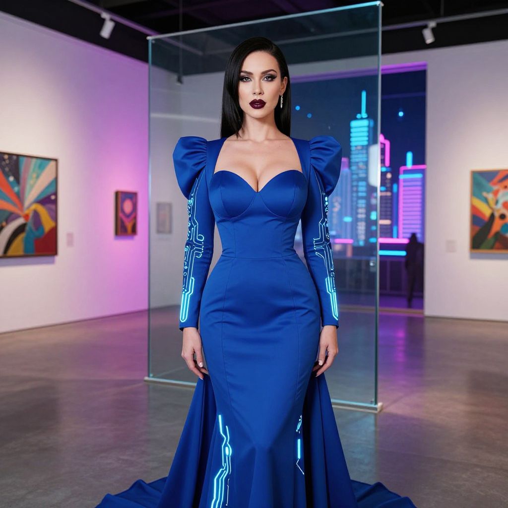 Photograph of a dark-haired woman in a vibrant blue, form-fitting gown with neon stripes, standing in a modern art gallery with neon cityscape