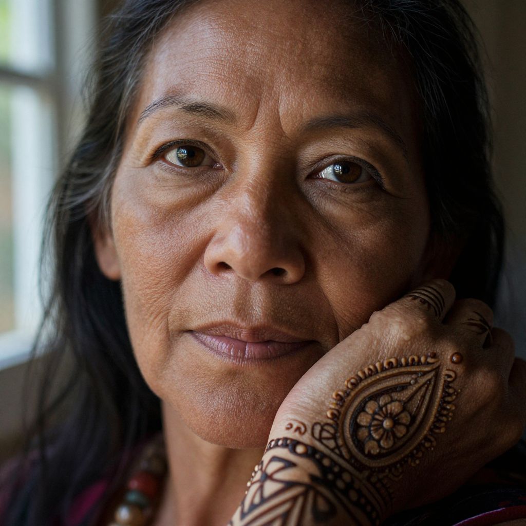 A highly detailed close-up portrait captures the enigmatic expression of a middle-aged Micronesian woman. An intricate henna tattoo wraps around her wrist, as if viewed from a 'bug's-eye' perspective. Soft sunlight filters through a nearby window, casting dramatic shadows on her face and accentuating the delicate patterns of the tattoo. Her piercing gaze reflects deep wisdom and untold stories, creating an emotional gradient that balances intrigue and empathy.
