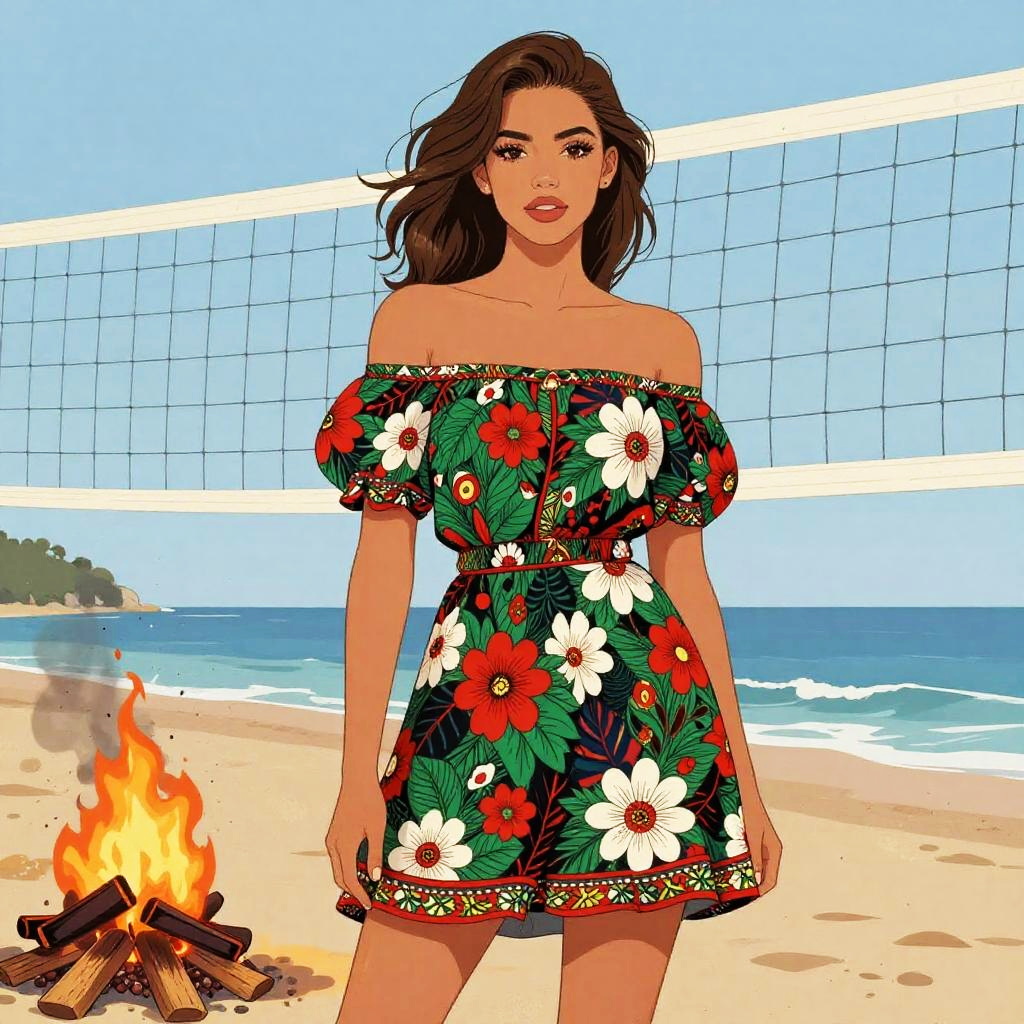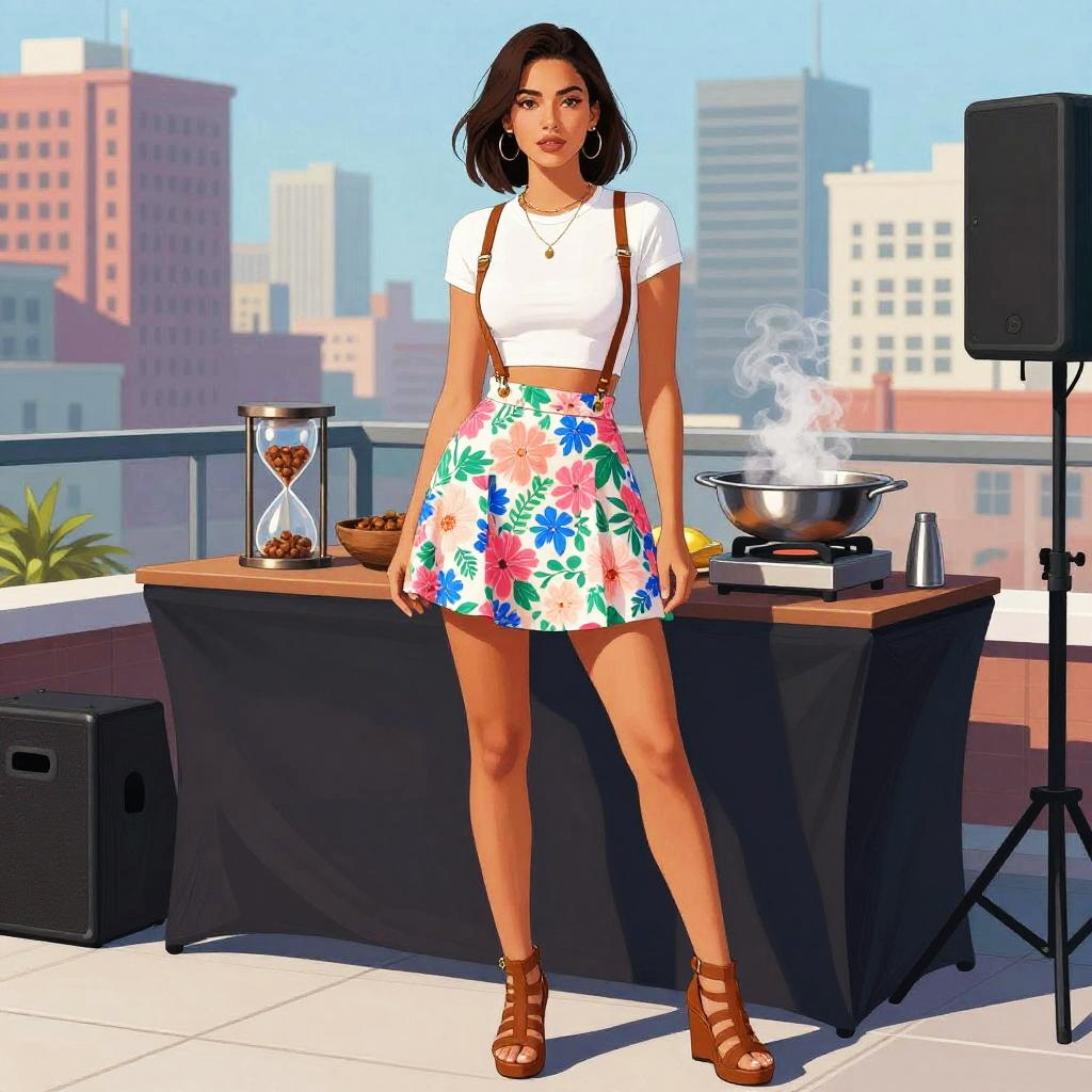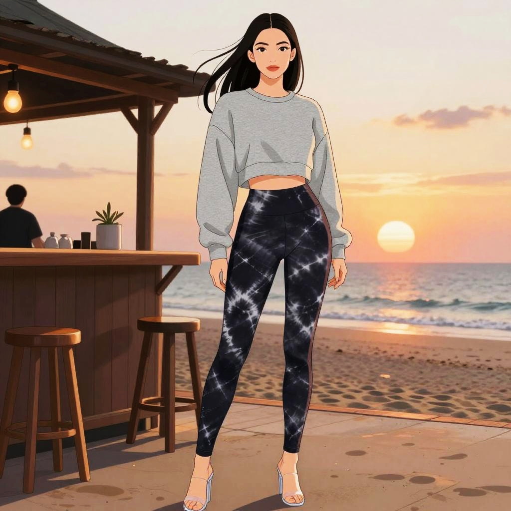 A athletic woman in casual streetwear, cropped black t-shirt and high-waisted leggings with blue and white paisley print, black ankle combat boots, stands confidently at a vibrant produce market on a tropical island, illustrated in the style of hakusensha. Sexy. Pretty face and beutiful eyes