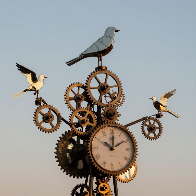 A symphony of clockwork birds, each composed of mismatched gears and mirrors, sings time in reverse during dusk.