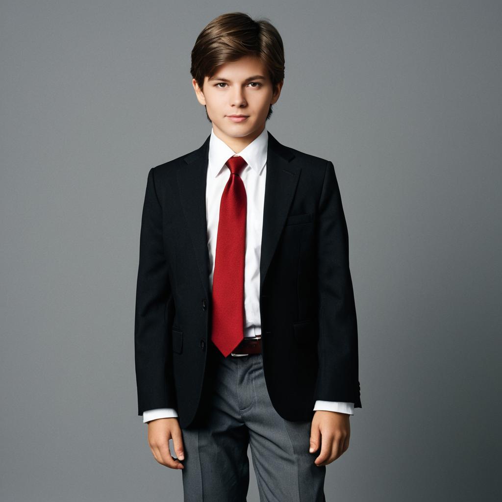 A young boy with brown hair wearing a formal business outfit consisting of a black jacket, white collared shirt, red necktie, and grey pants. He is standing against a simple grey background, facing the camera with a neutral expression. The attire is classic and professional, suitable for business or formal occasions.